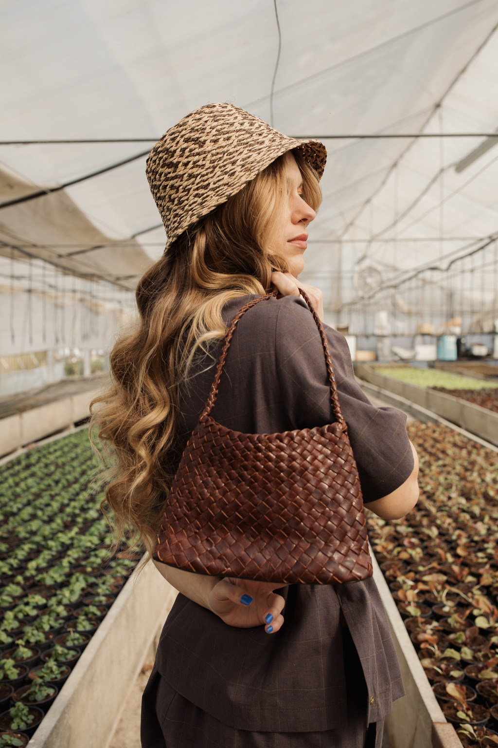 Accessori preziosi come le borse intrecciate in pelle e le calzature lucenti, esprimono vibrazioni moderne e un lusso discreto, incoraggiando un senso di autenticità e libertà.