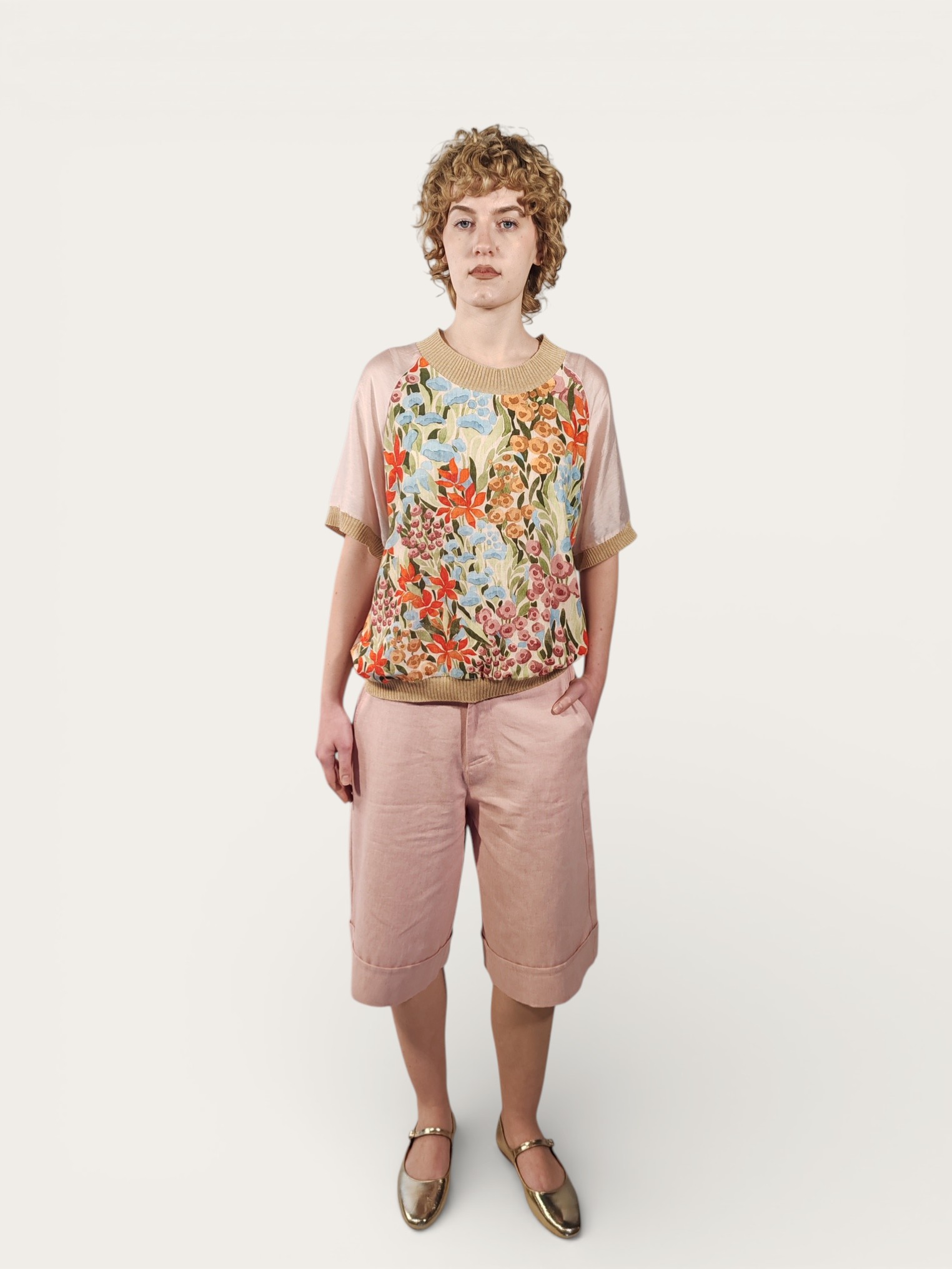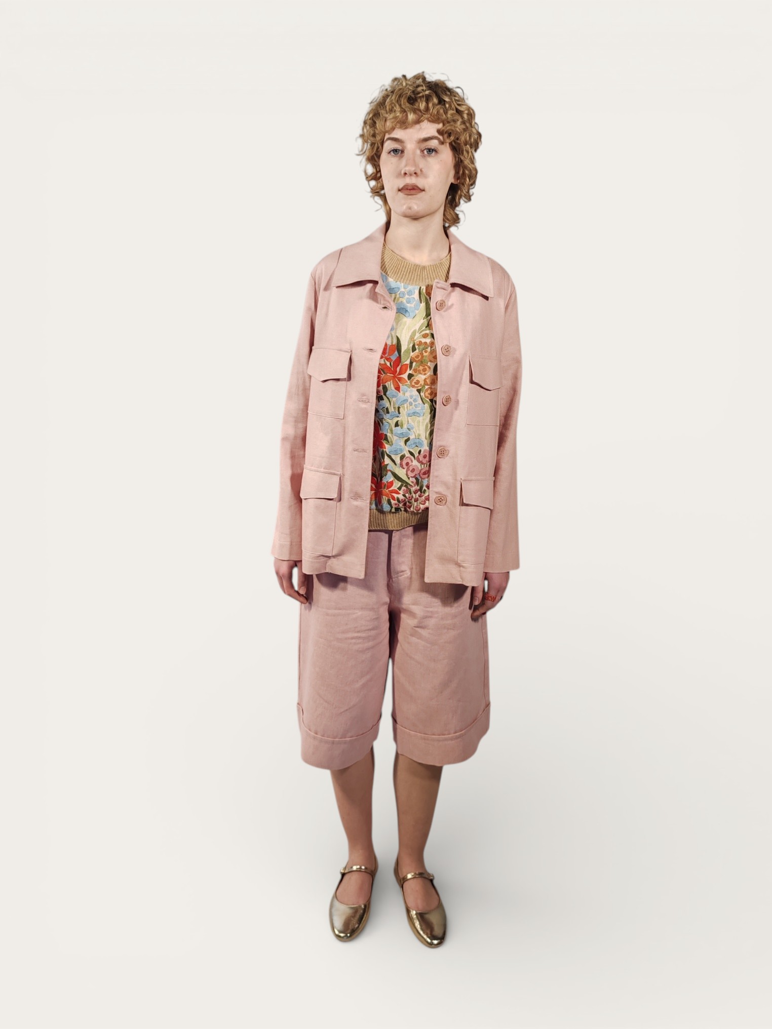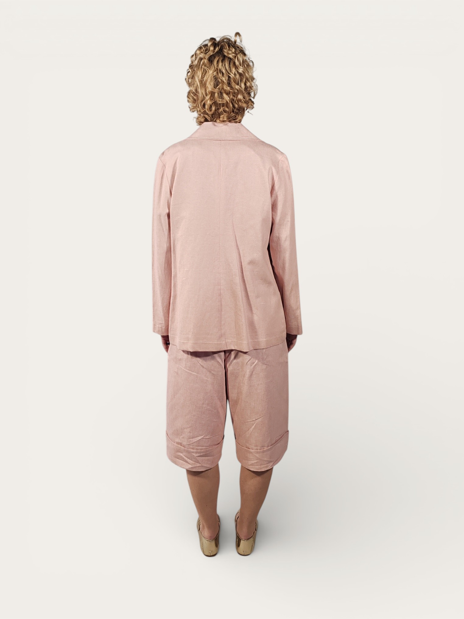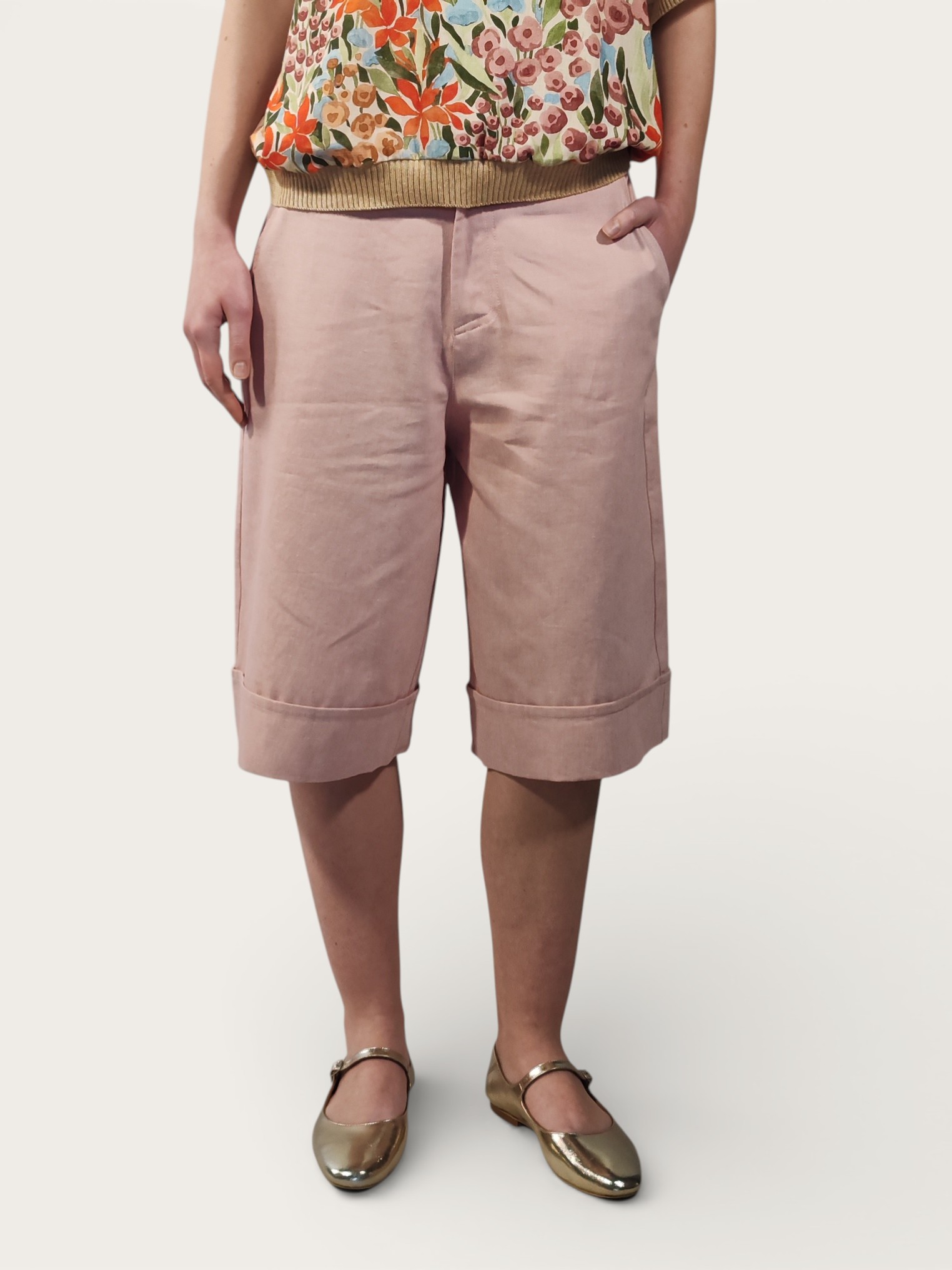 Bermuda in misto cotone e lino caratterizzato da una finitura opaca che esalta la delicatezza della tonalità rosa cipria su una trama naturale e traspirante.