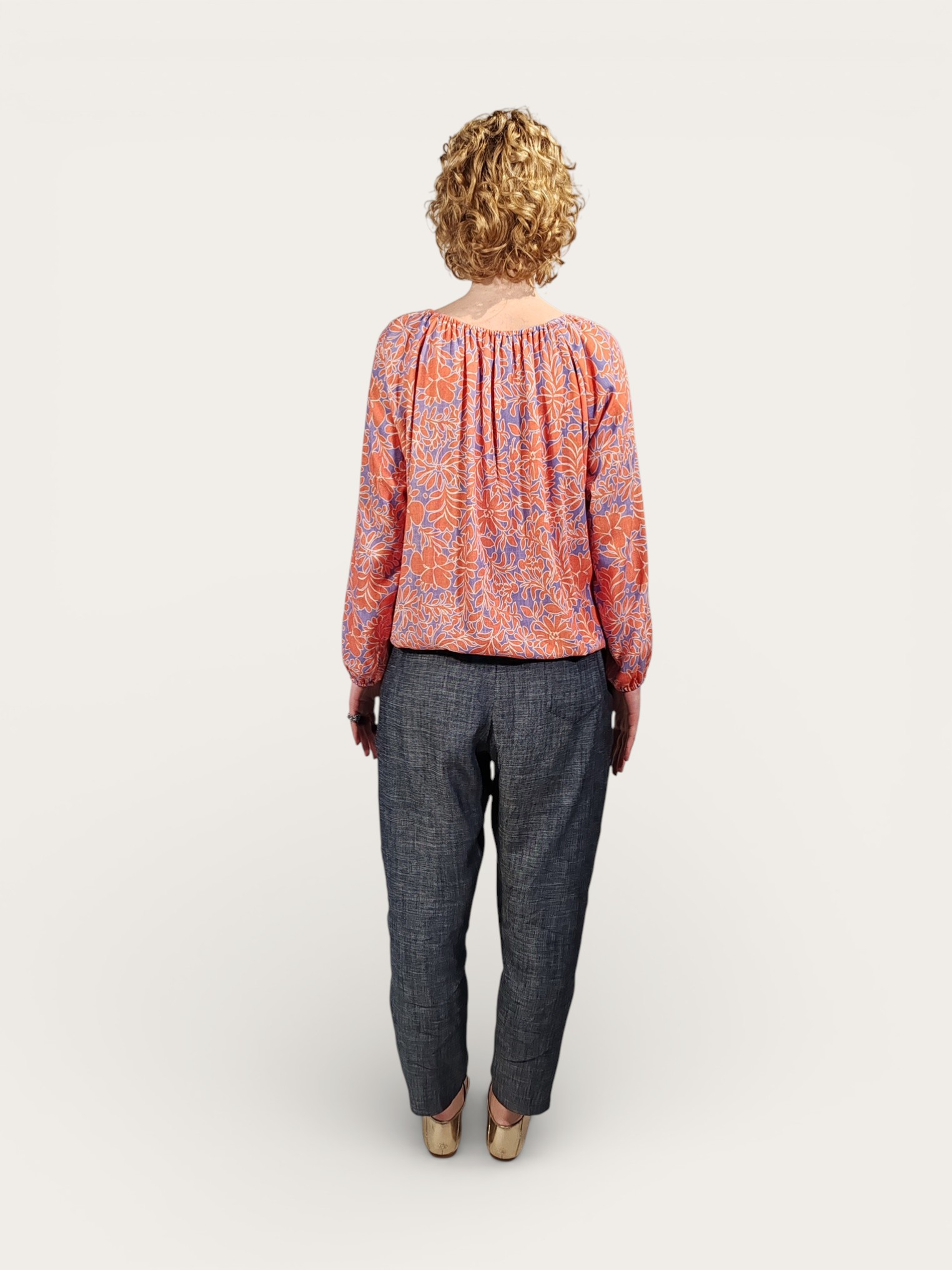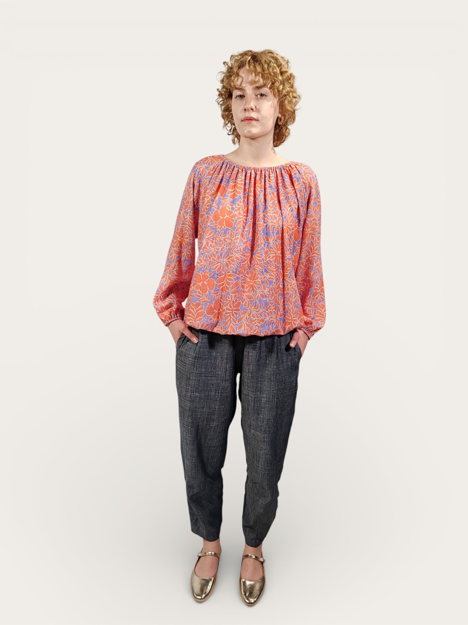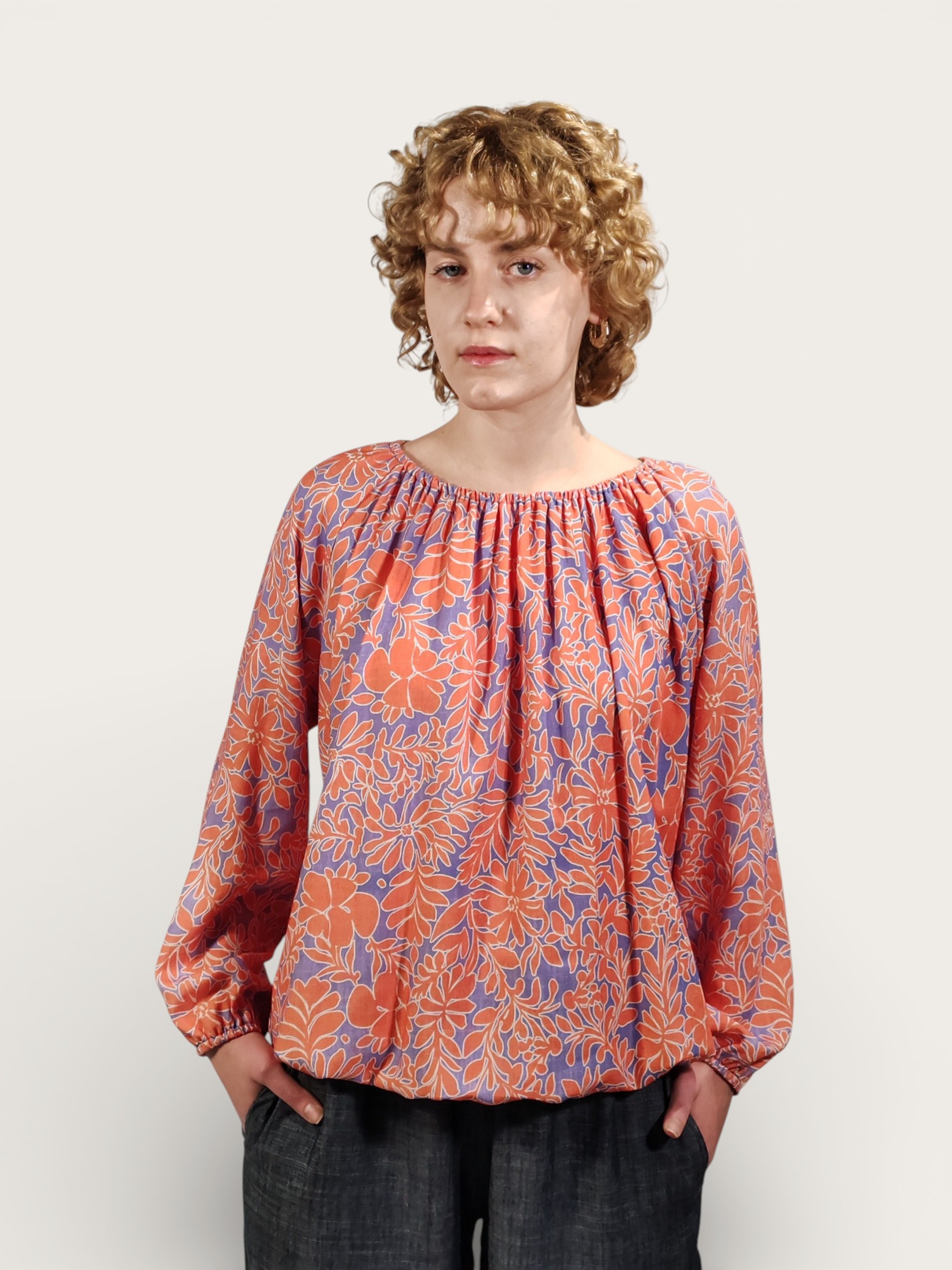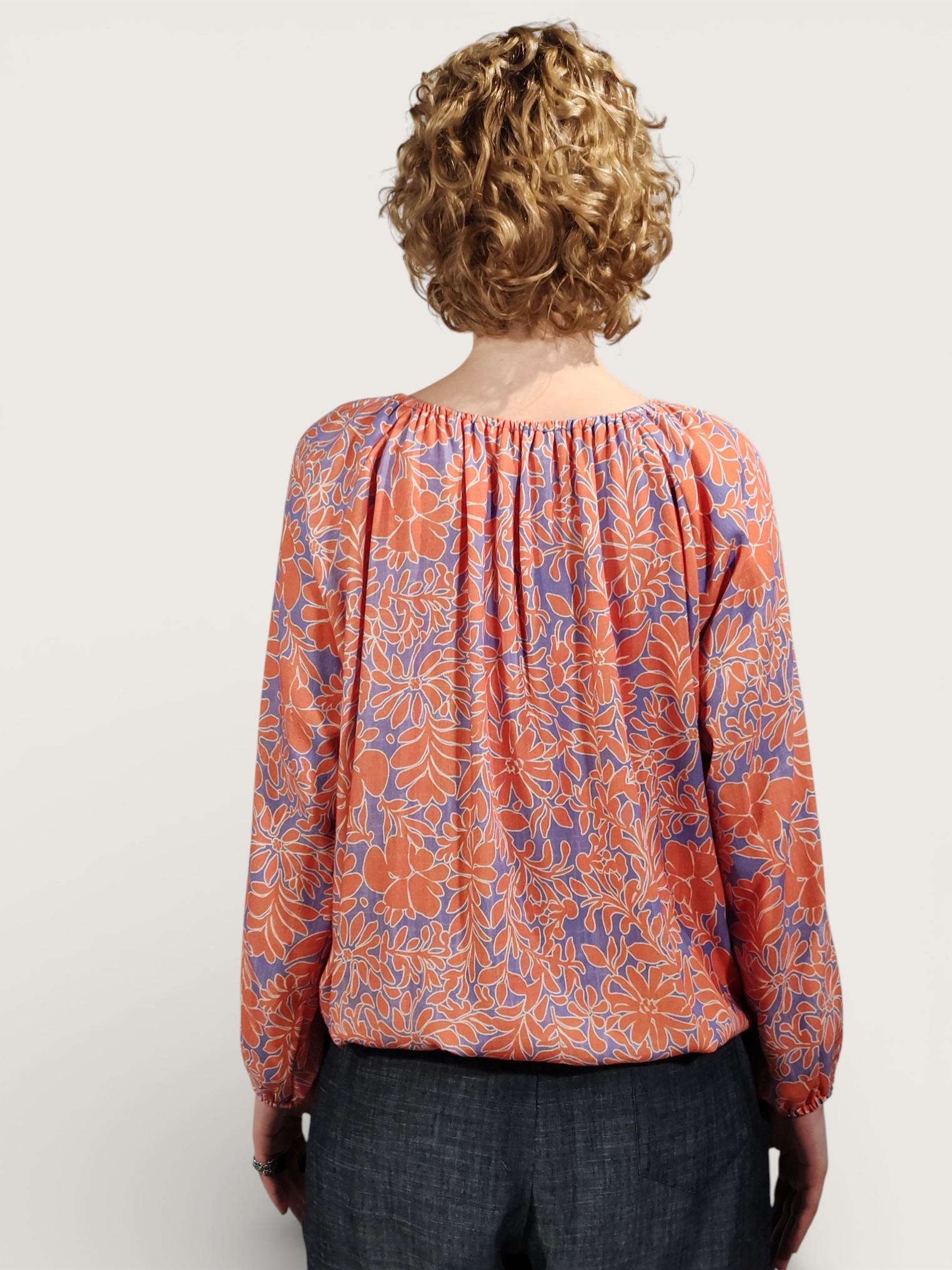 Camicetta in misto lino, caratterizzata da una vivace stampa floreale all-over che intreccia tonalità arancio intenso su un raffinato sfondo blu pervinca.
