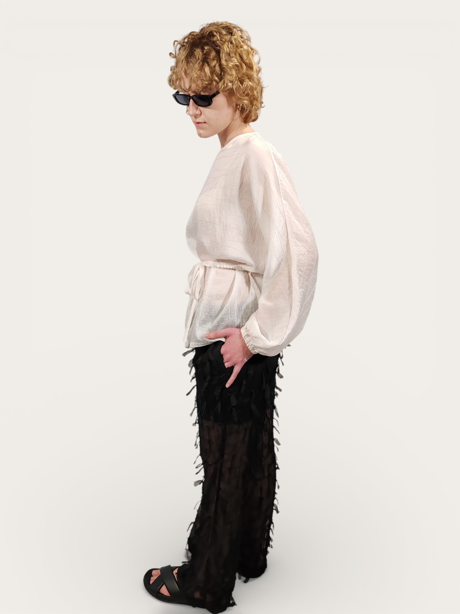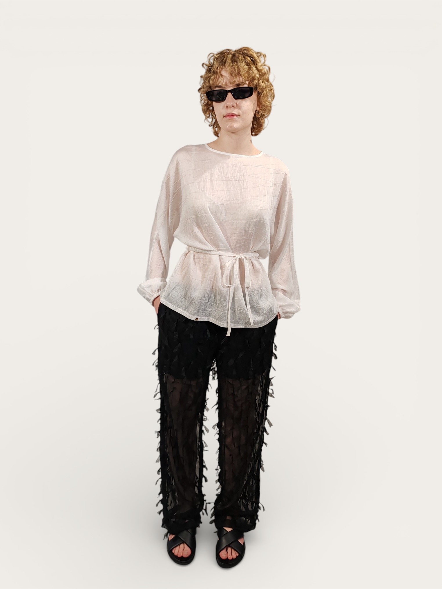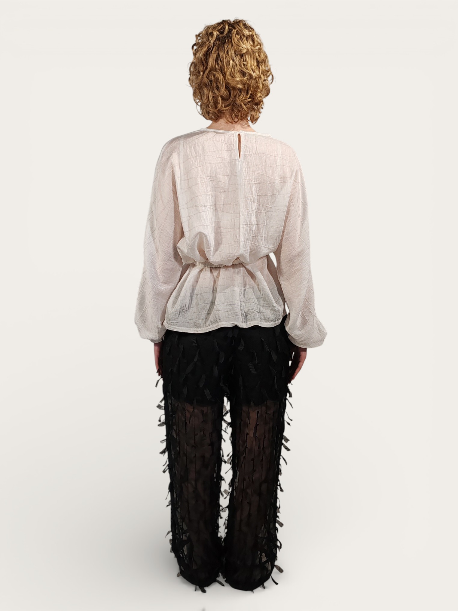 Blusa in tessuto leggero e semitrasparente, caratterizzata da una raffinata texture a rilievo con sottili linee orizzontali che creano un delicato gioco di ombre e trasparenze.