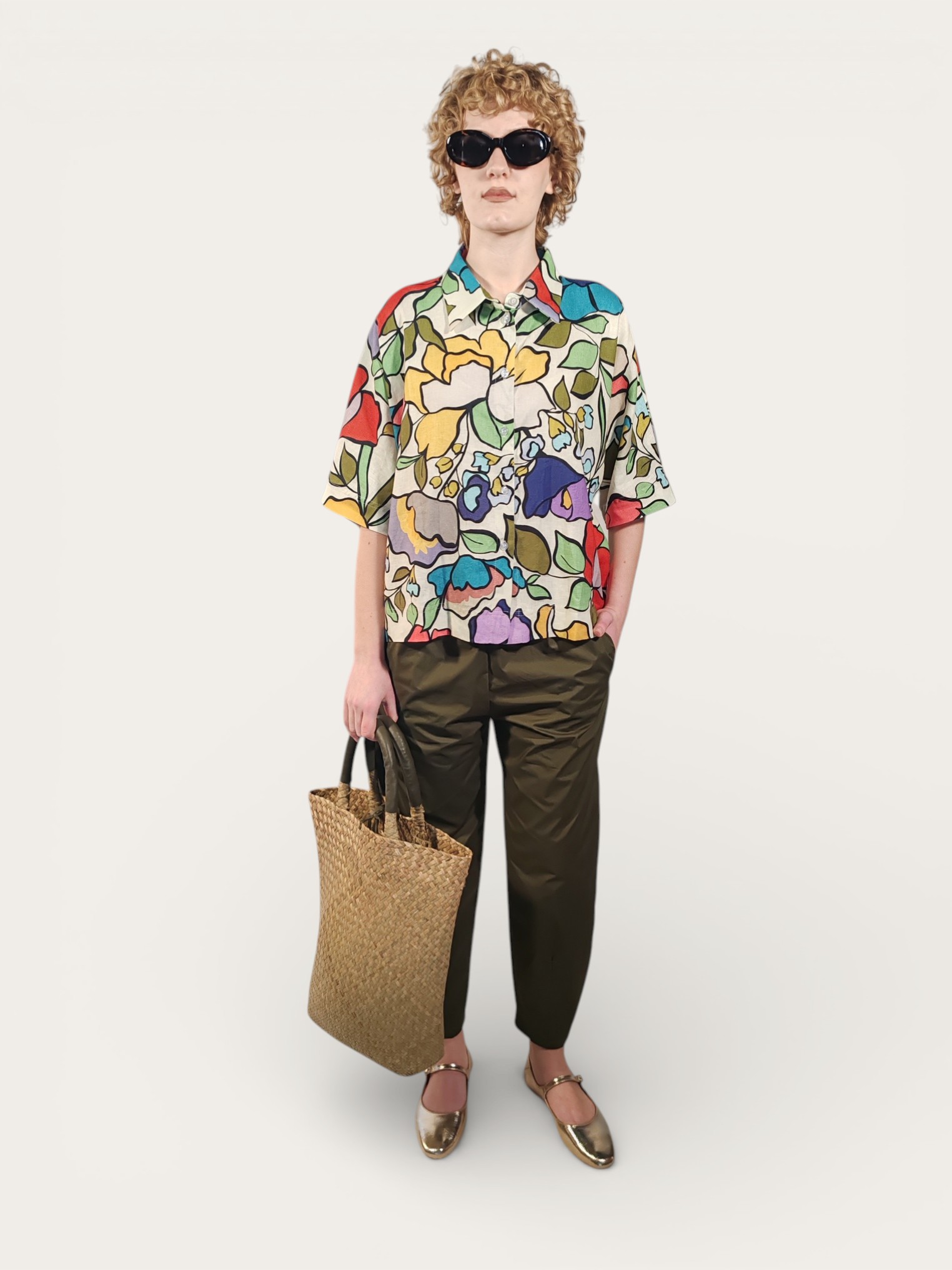 Camicia boxy in misto lino, presenta una vivace stampa floreale macro caratterizzata da un design artistico che mescola audaci tonalità di rosso, giallo, viola e azzurro su una base neutra.