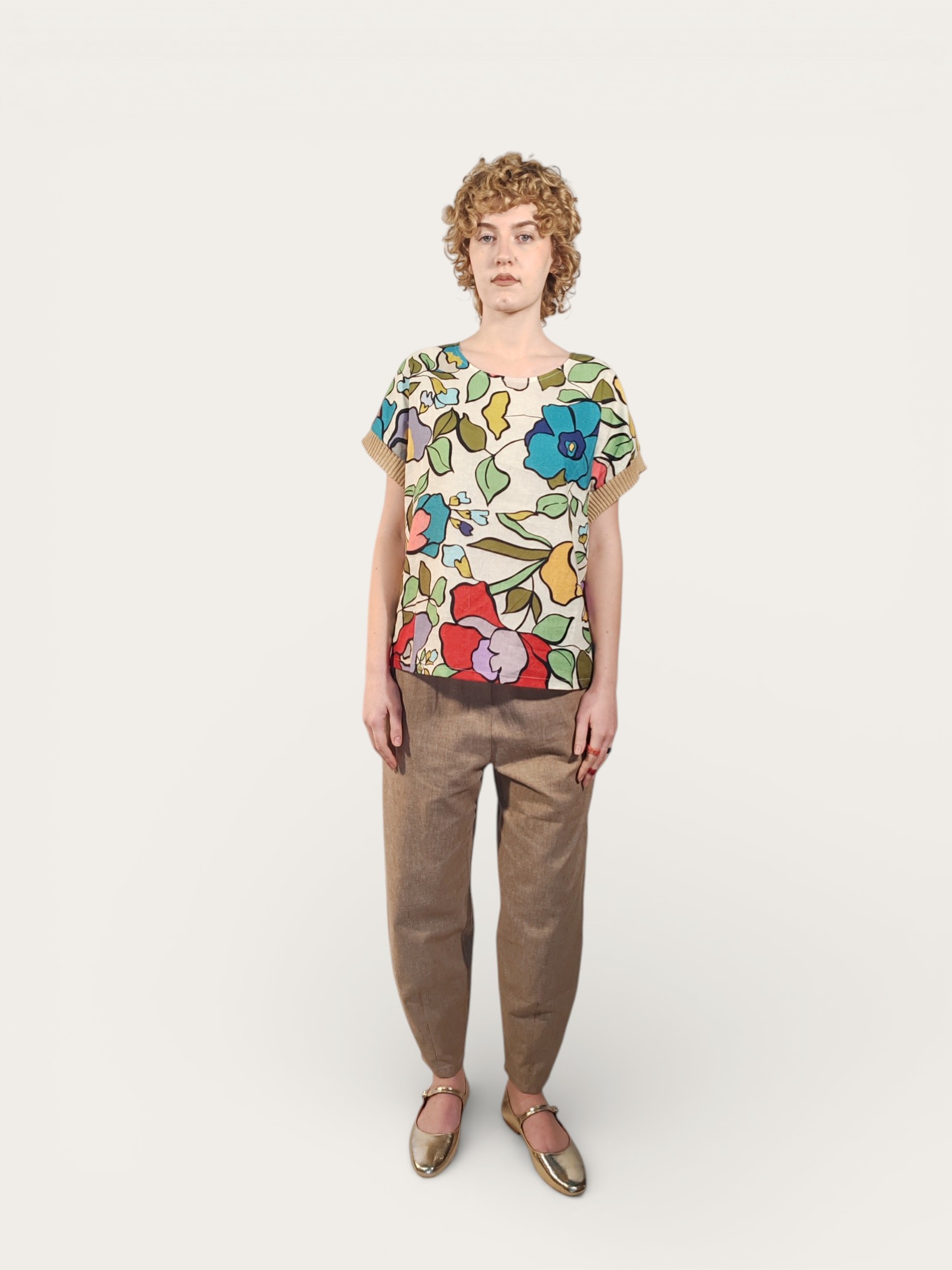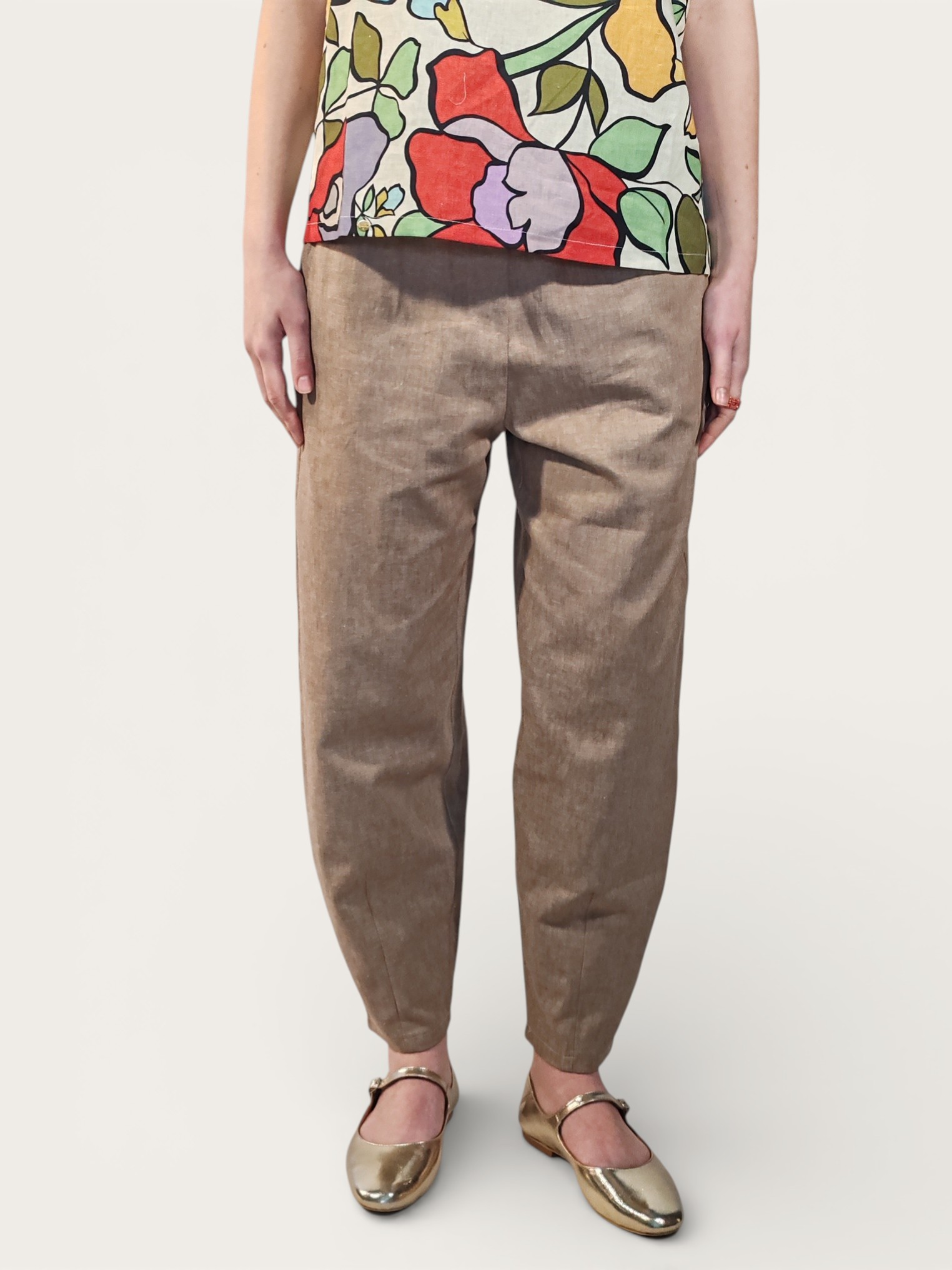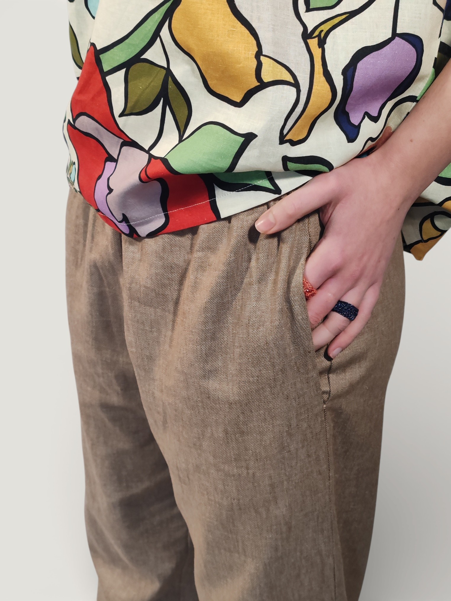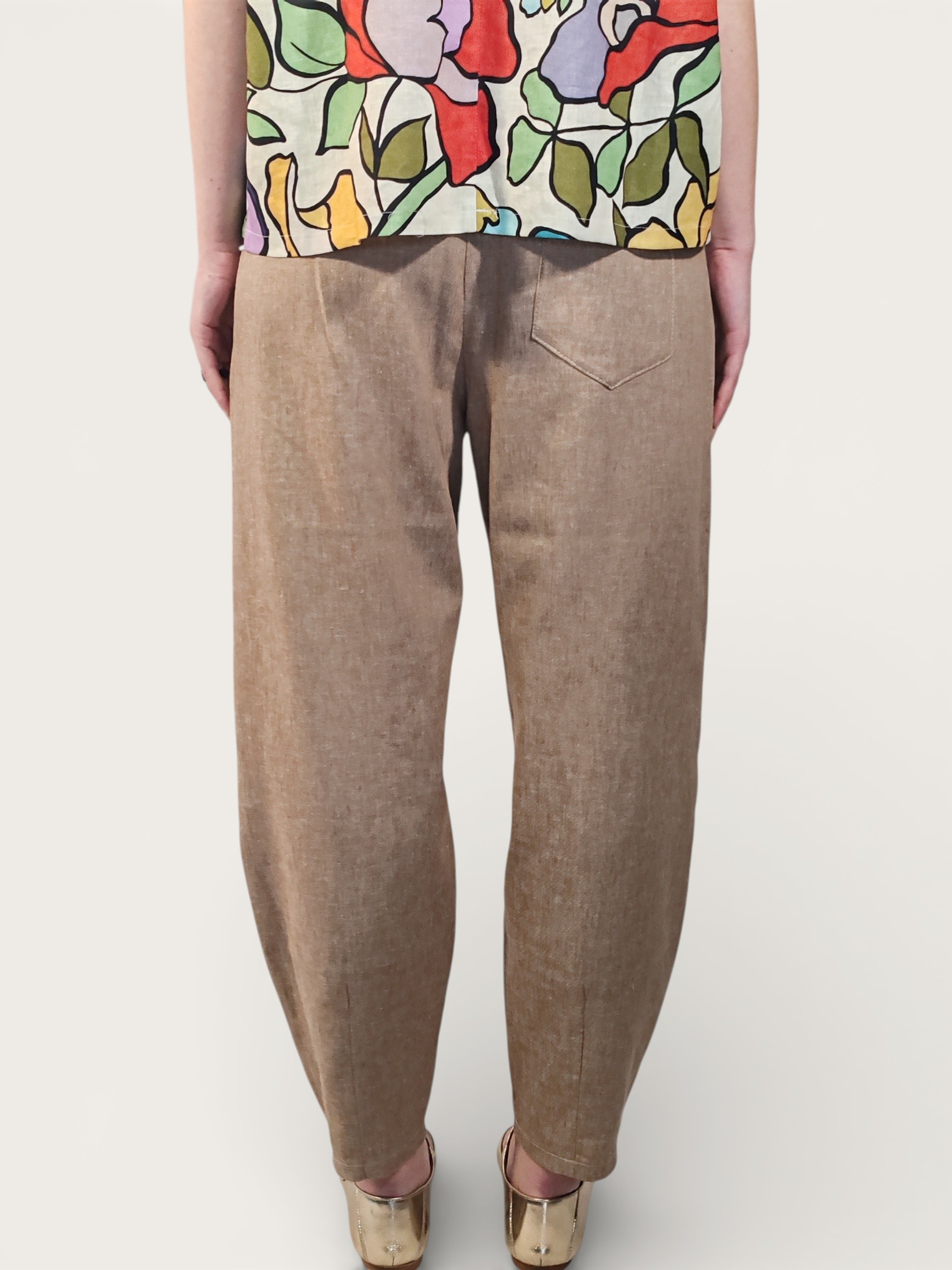 Pantalone in tela di lino e cotone, caratterizzato da una mano materica e una finitura naturale che esalta la tonalità marroncina.