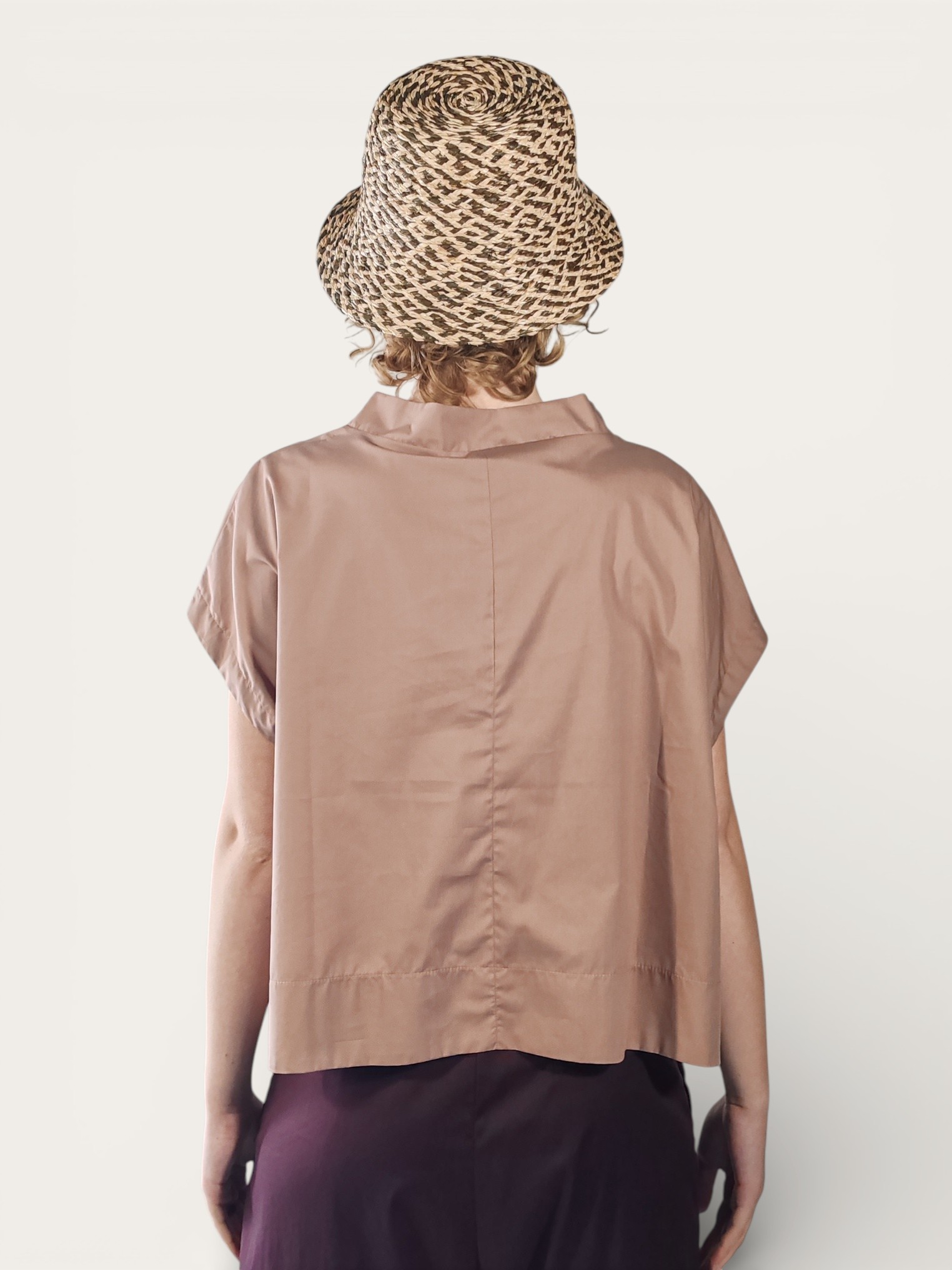 Blusa a maniche corte in cotone color rosa antico, caratterizzata da una mano ferma e una finitura opaca che dona al capo una struttura definita e un aspetto pulito.