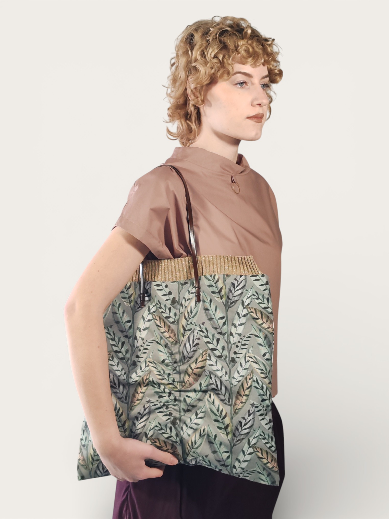 Il design è definito da un collo alto a listino, impreziosito da un cerchio metallico frontale che aggiunge un punto luce moderno e geometrico alla silhouette.