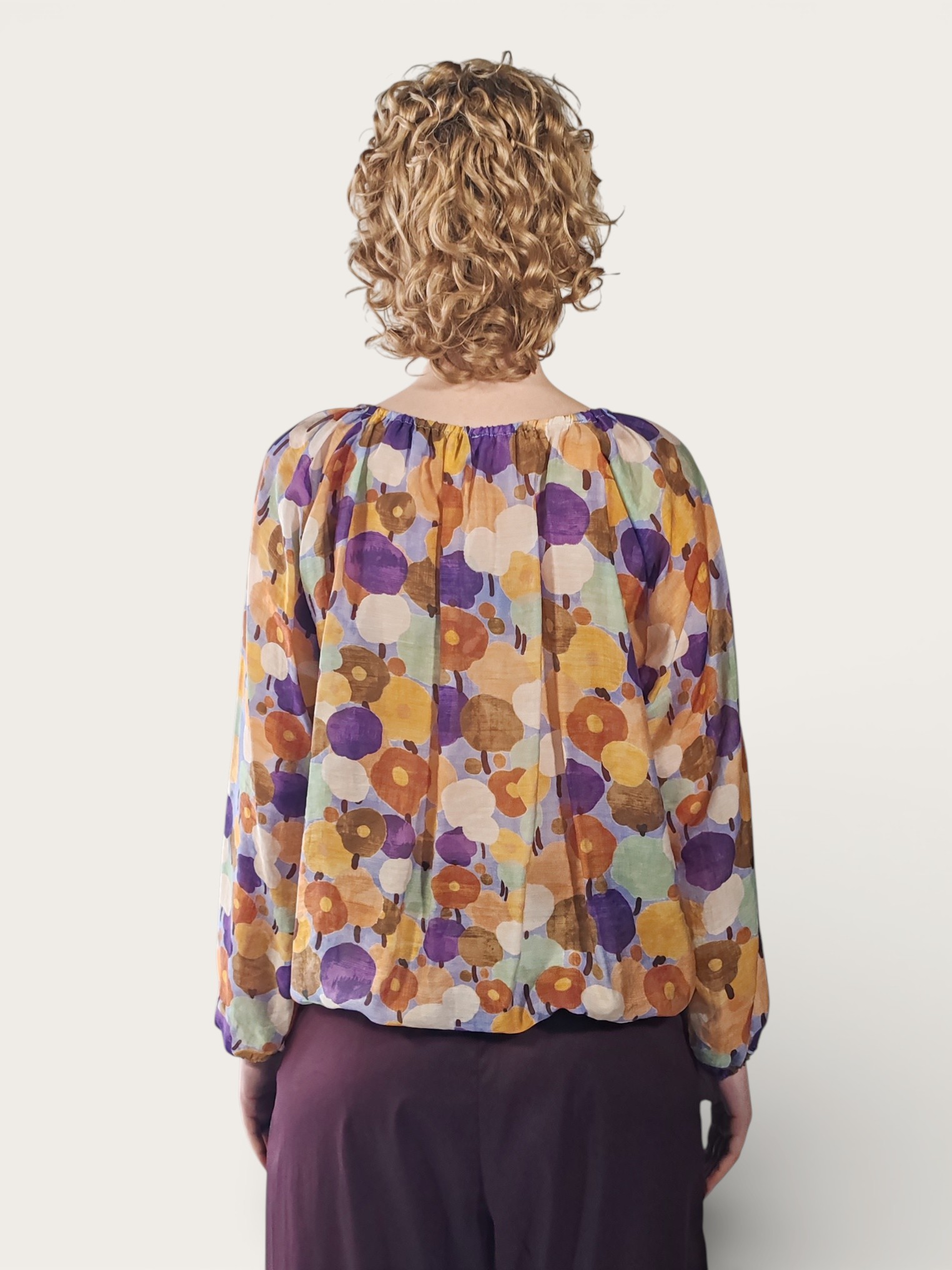Camicetta in un leggerissimo tessuto semitrasparente, caratterizzata da una vivace fantasia floreale multicolore che crea un effetto artistico e dinamico.
