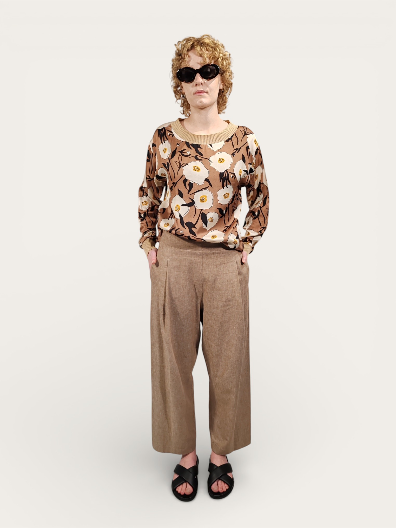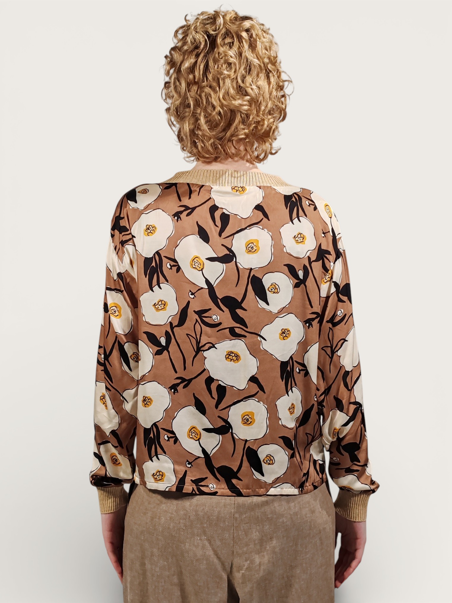 Blusa a maniche lunghe in satin di viscosa, caratterizzato da una mano fluida e una finitura lucida che esalta la vividezza del macro-motivo floreale panna e nero su fondo color cannella.