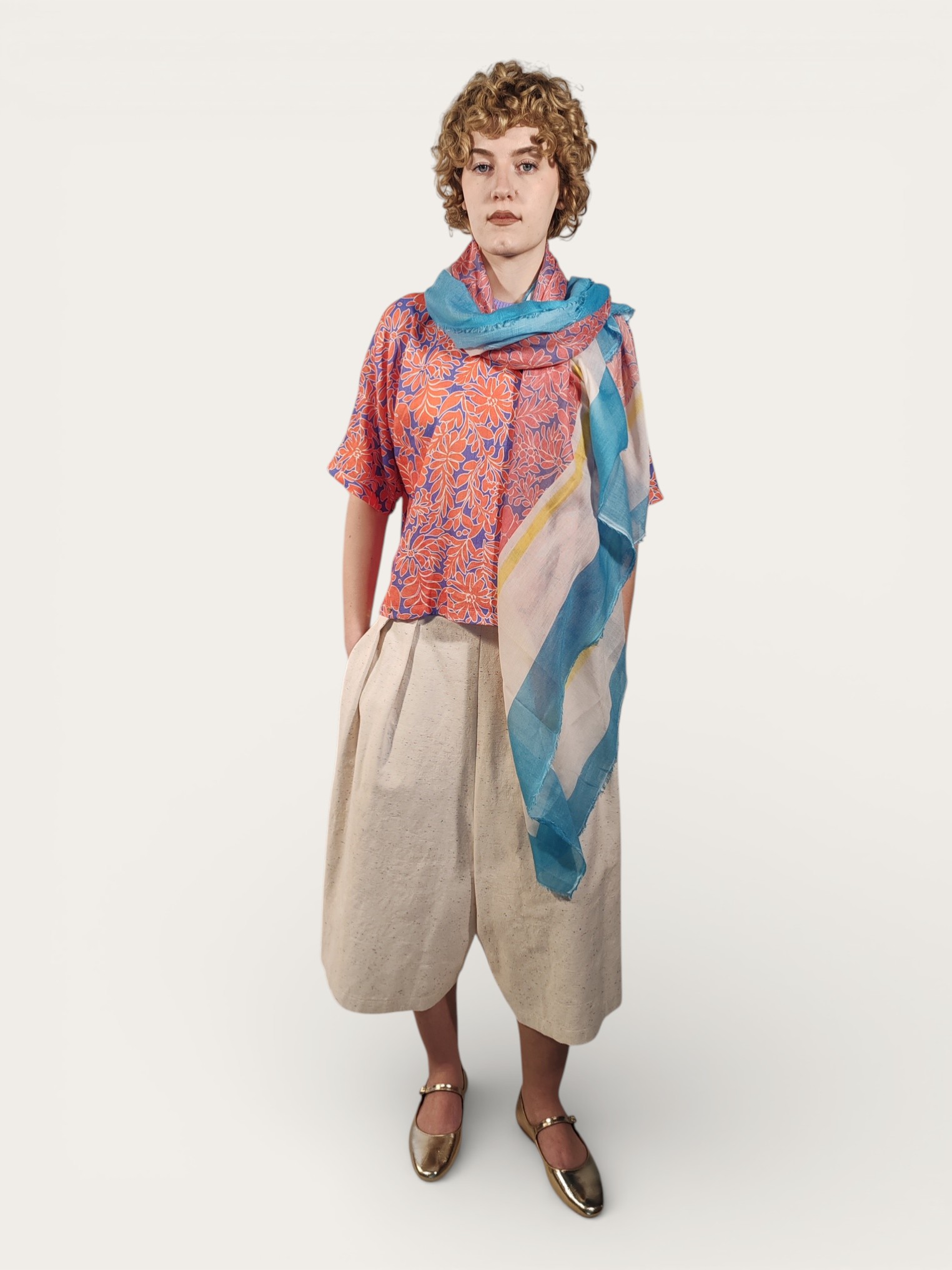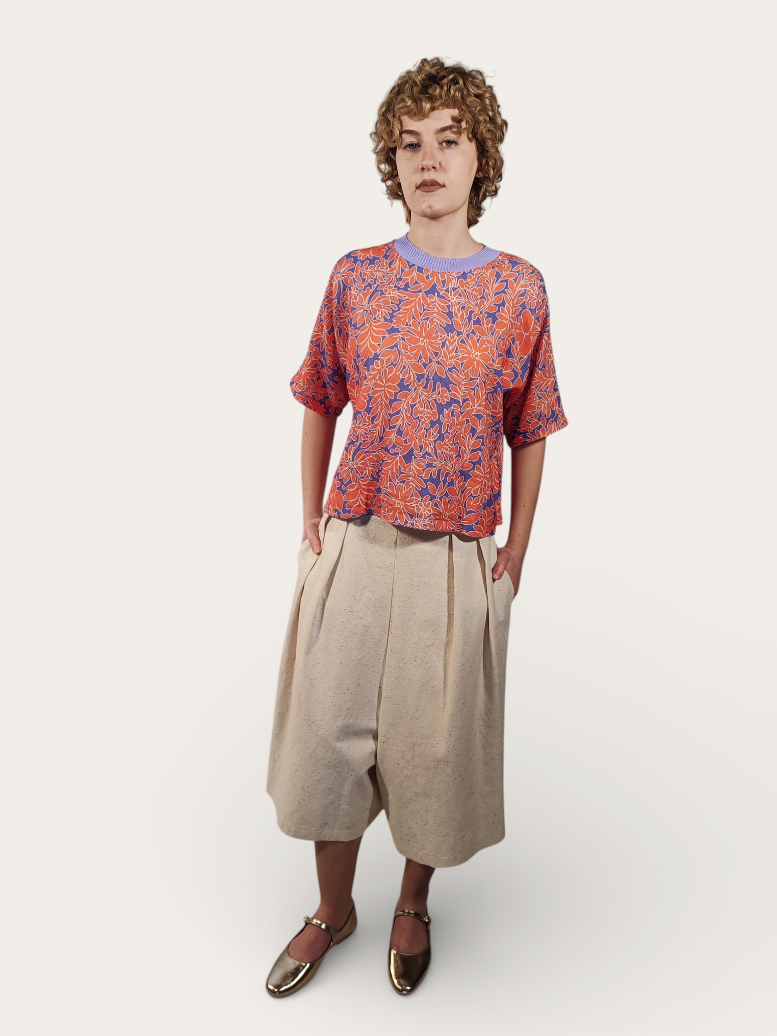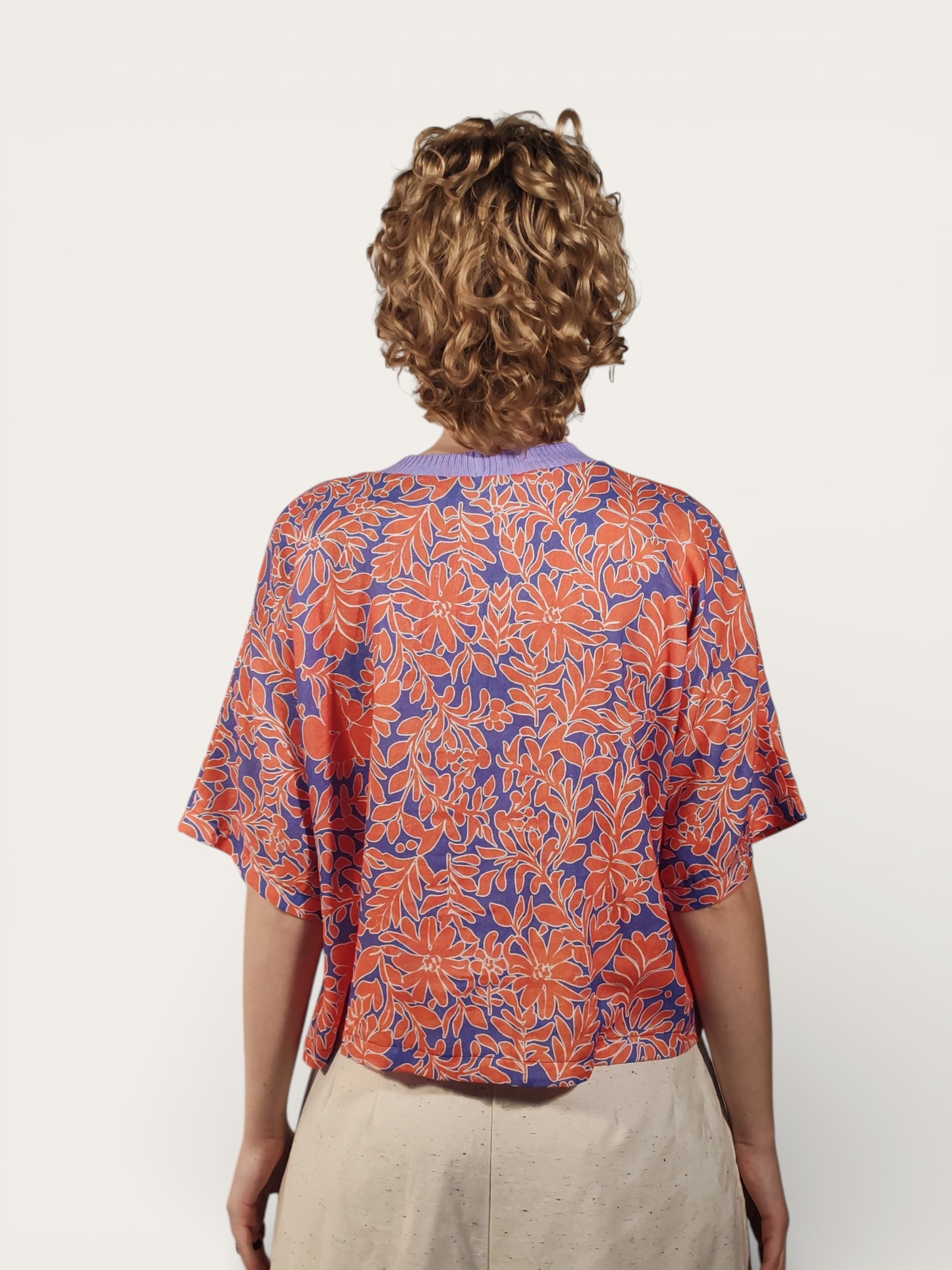 Blusa a maniche corte caratterizzata da una vivace stampa floreale all-over che intreccia tonalità arancio intenso e bianco su un raffinato sfondo blu pervinca.