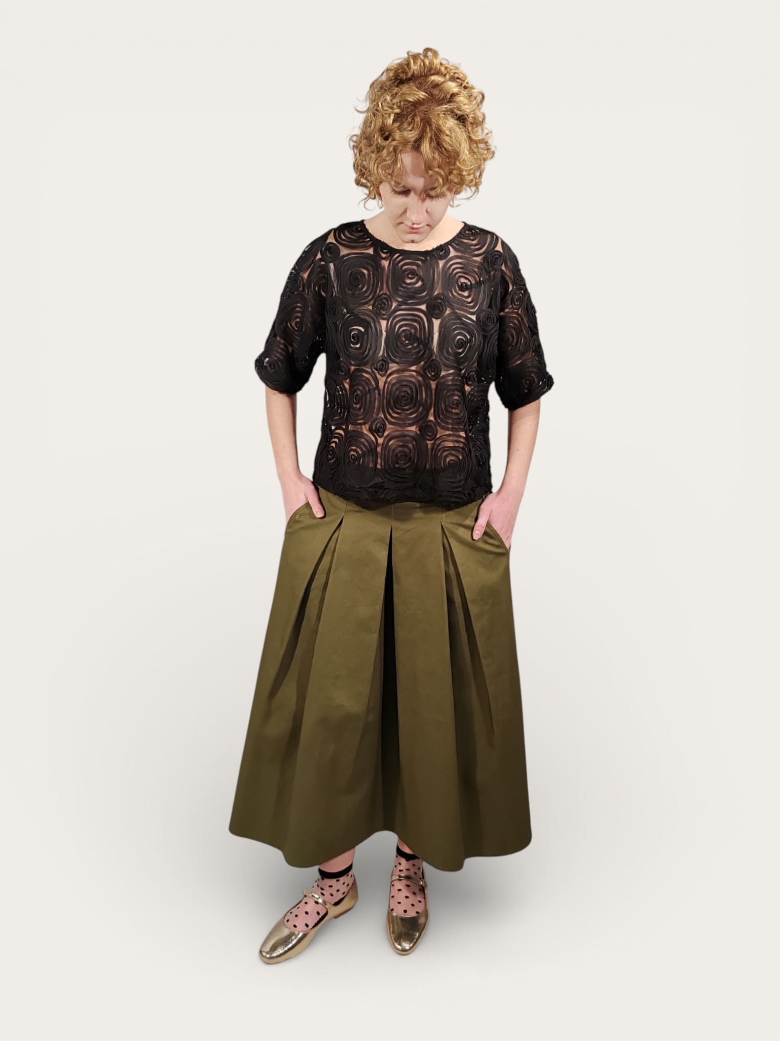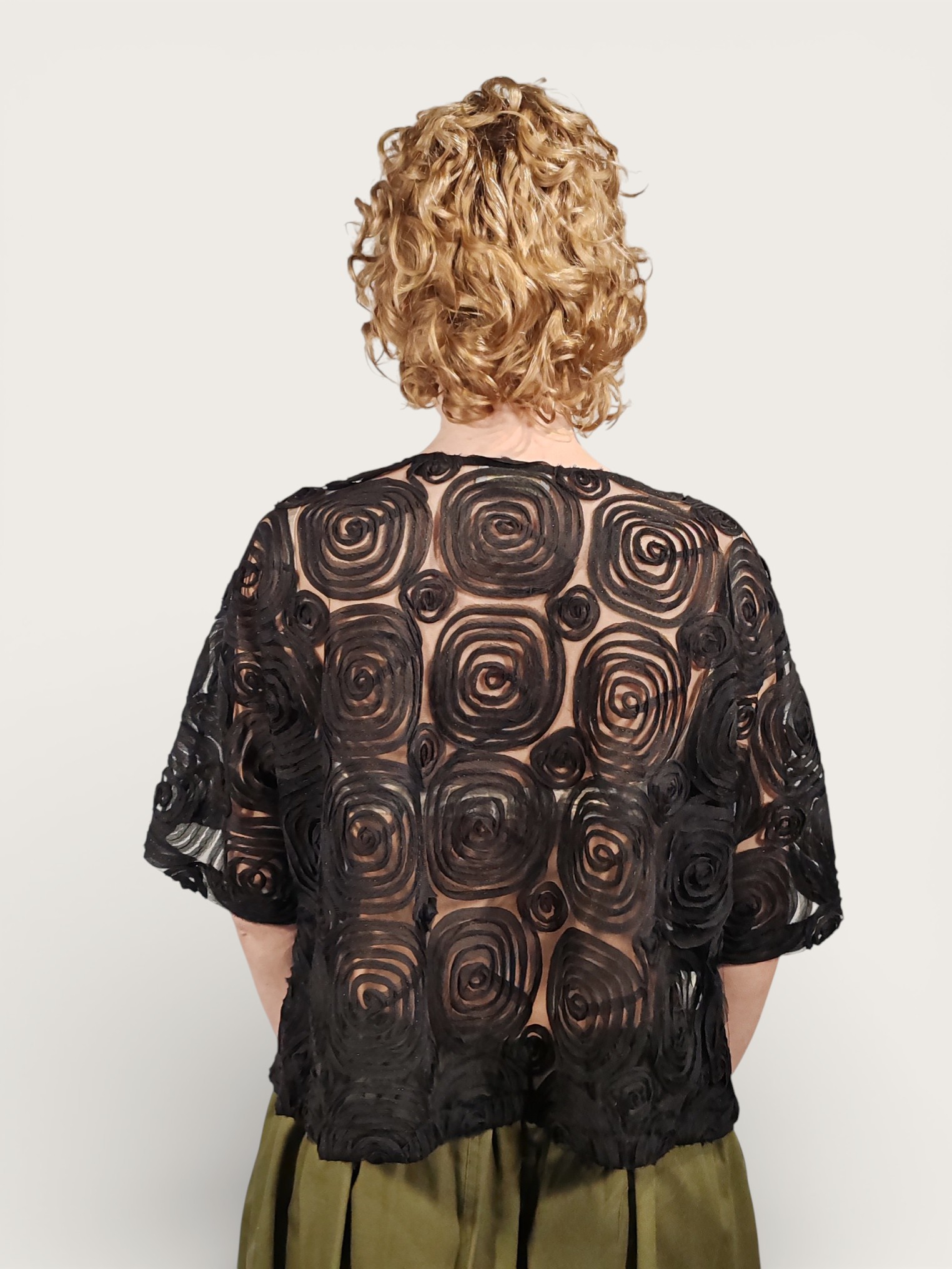 Blusa in tulle nero, caratterizzata da un gioco di trasparenze e un motivo a spirali tridimensionali applicate all-over.