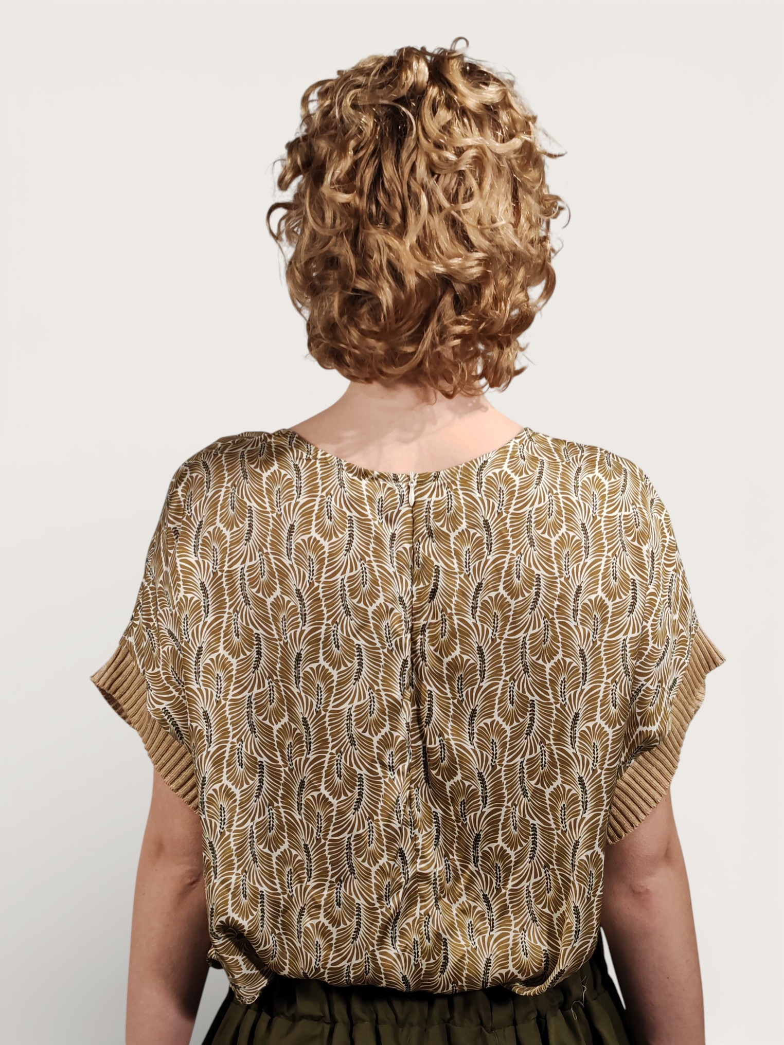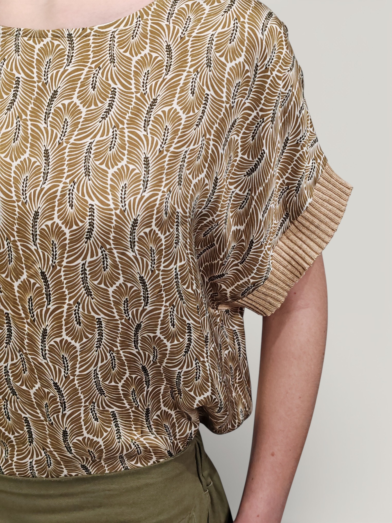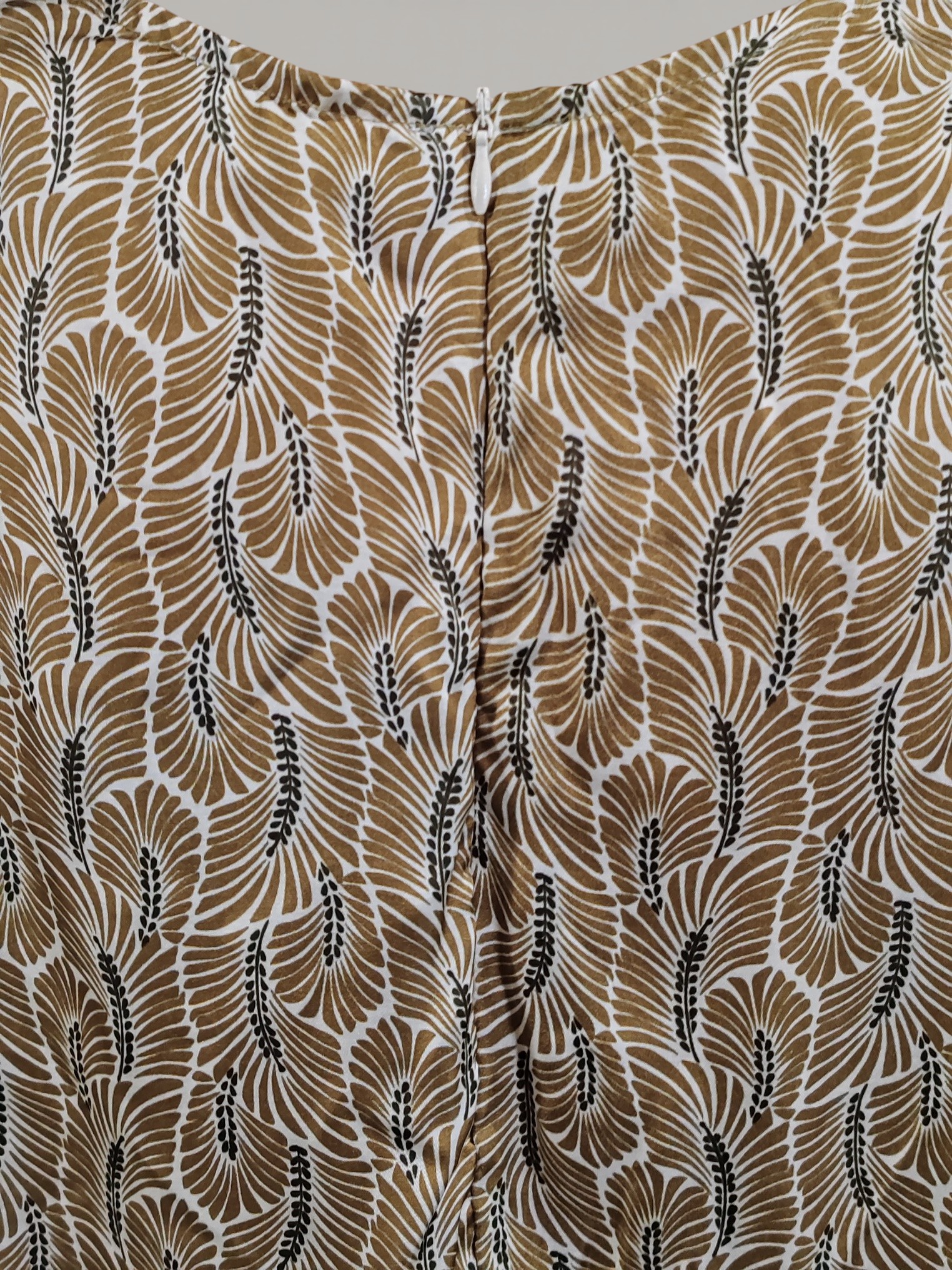 Fantasia all-over con motivo di foglie stilizzate, sui toni dell’ocra.