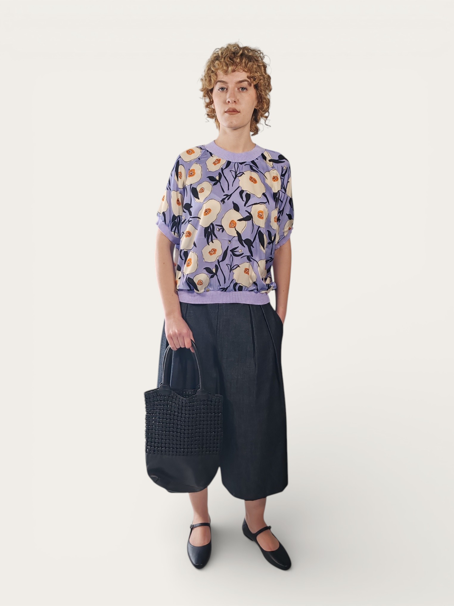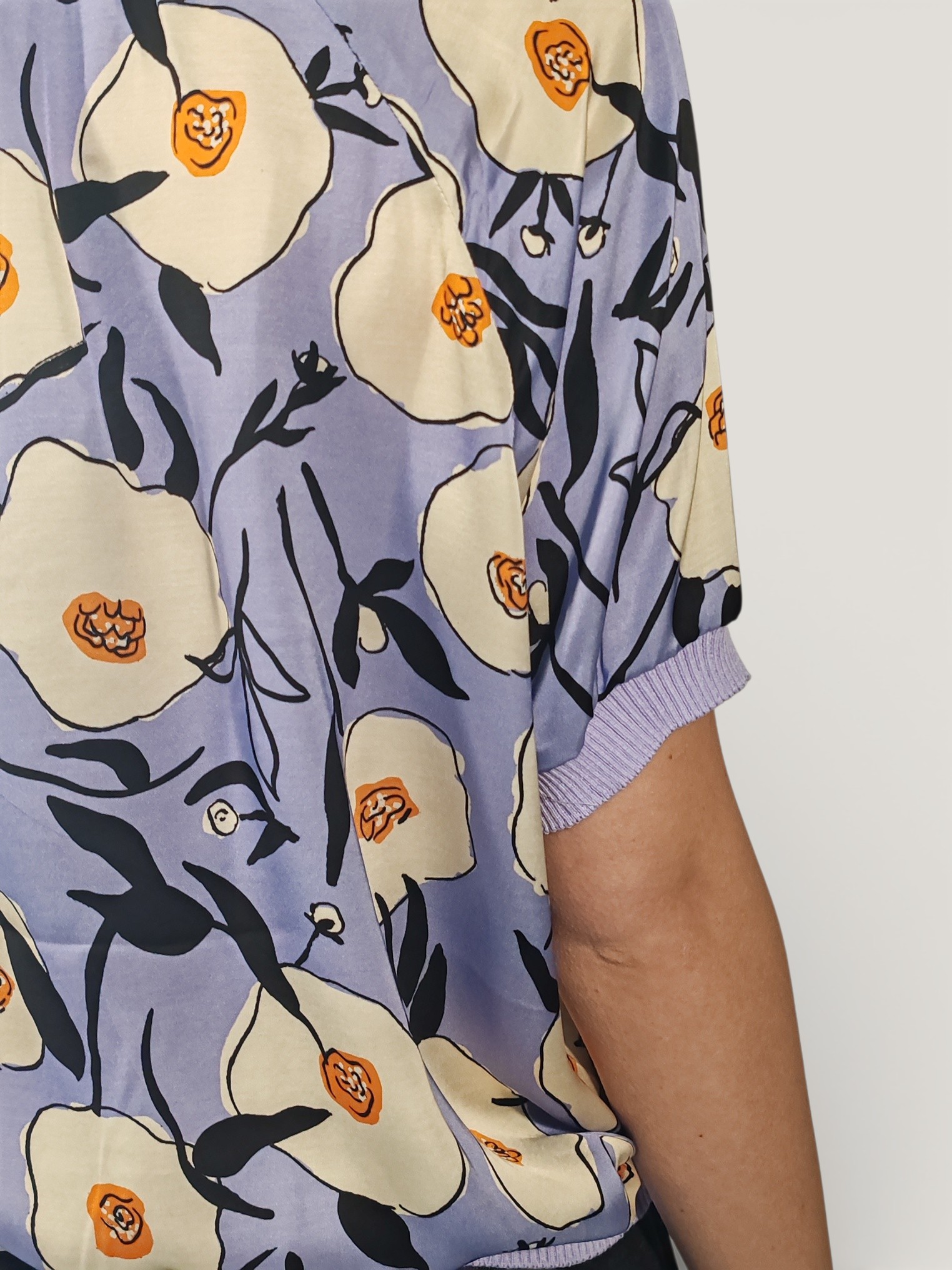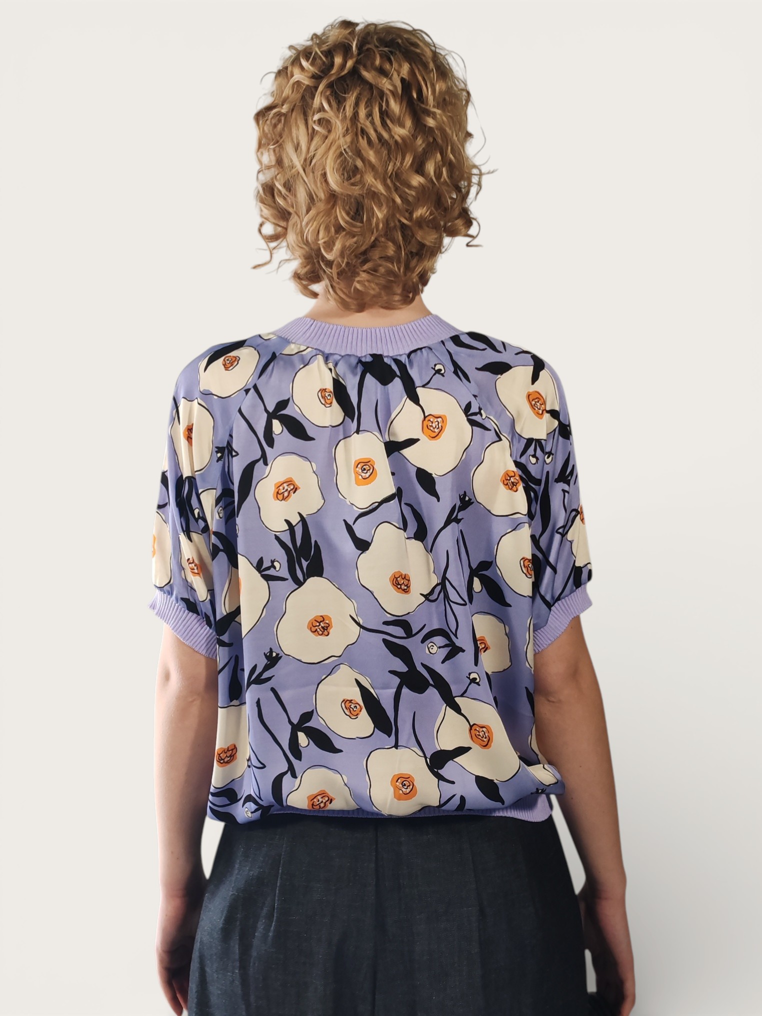 Blusa in viscosa, caratterizzata da una mano fluida e una finitura opaca che esalta la vividezza dei fiori color burro sulla base nei toni del lilla .
