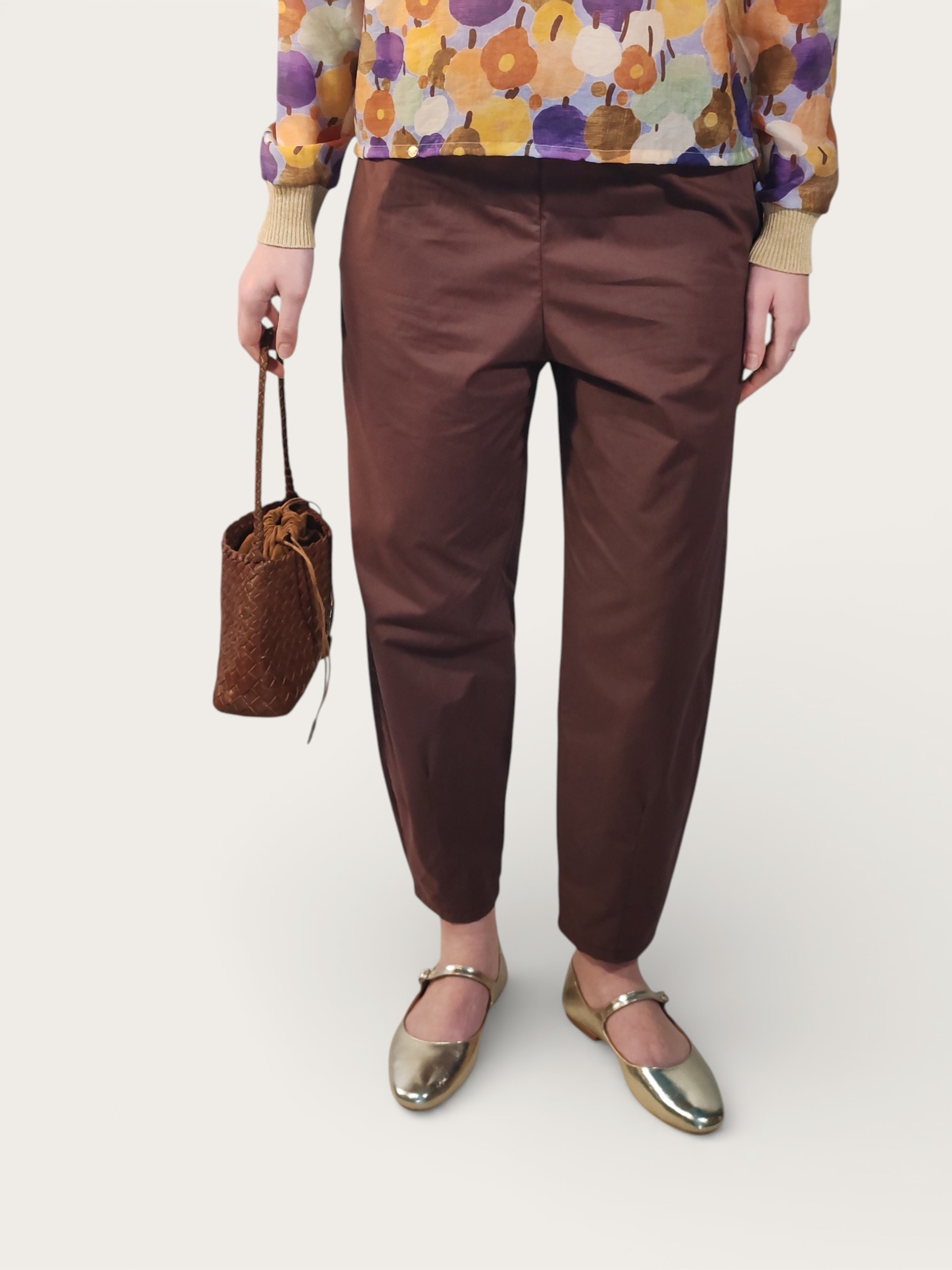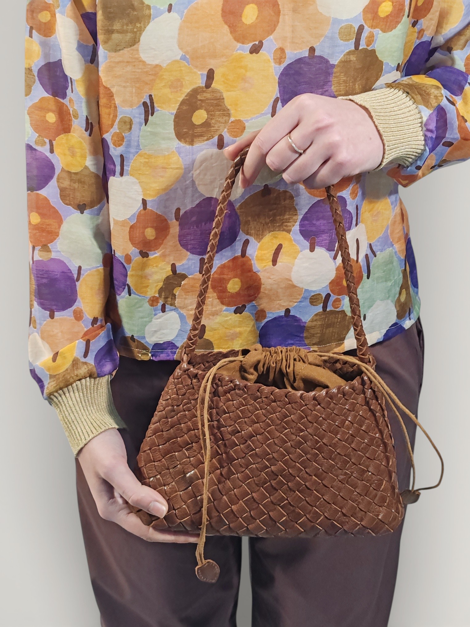 La silhouette morbida e arrotondata è valorizzata da un sottile manico tubolare intrecciato, che ne accentua l’estetica artigianale e ricercata.