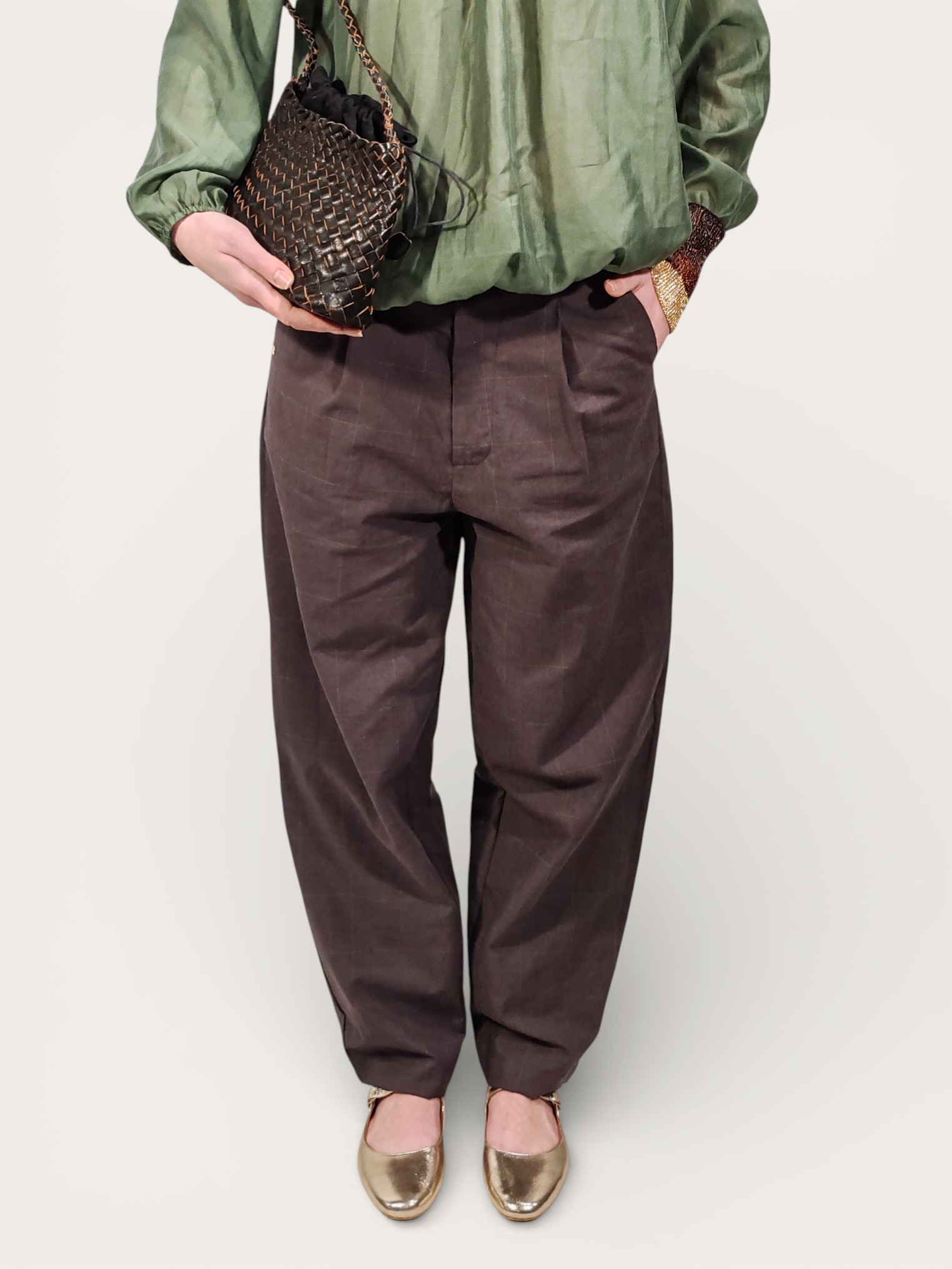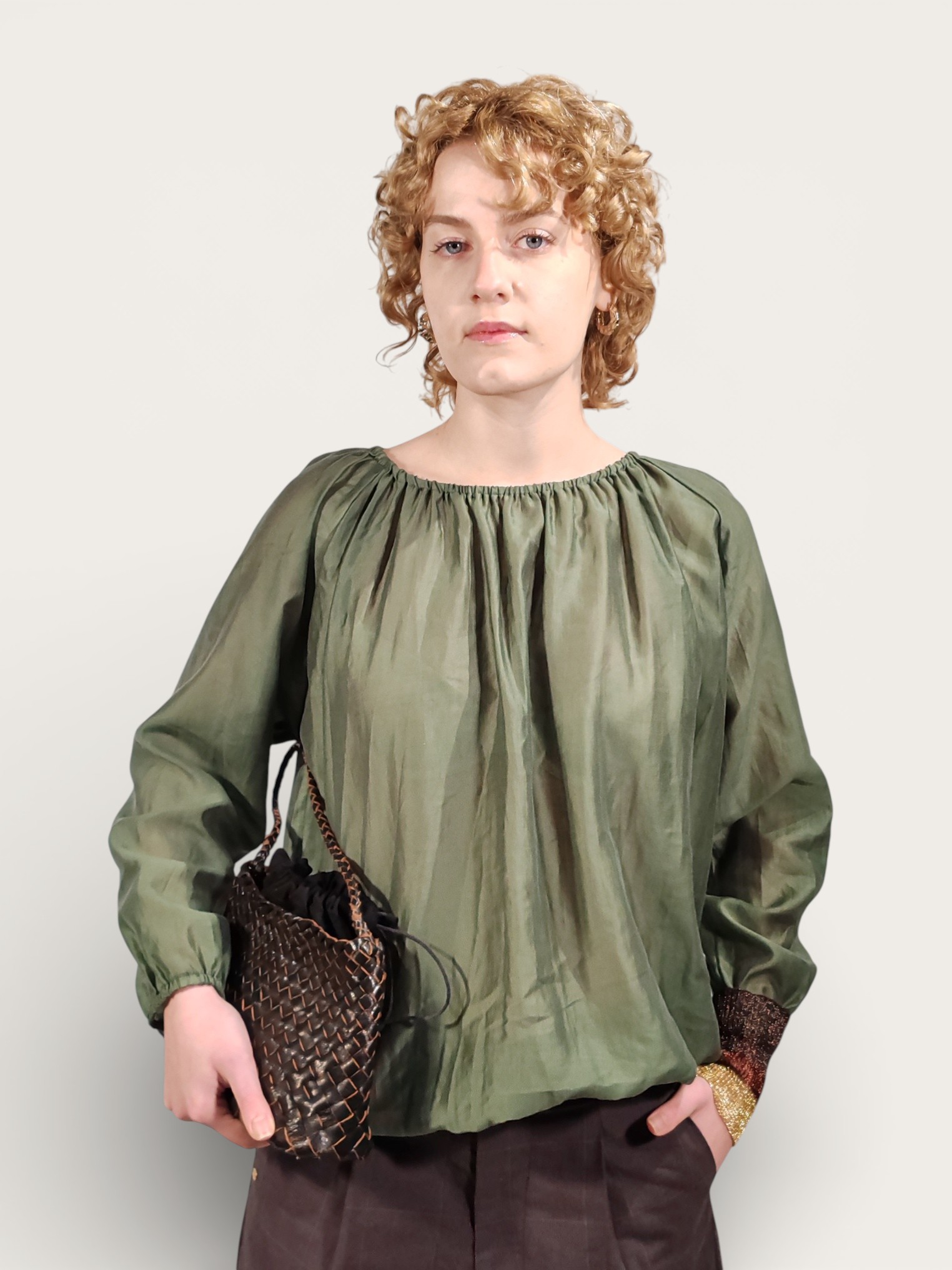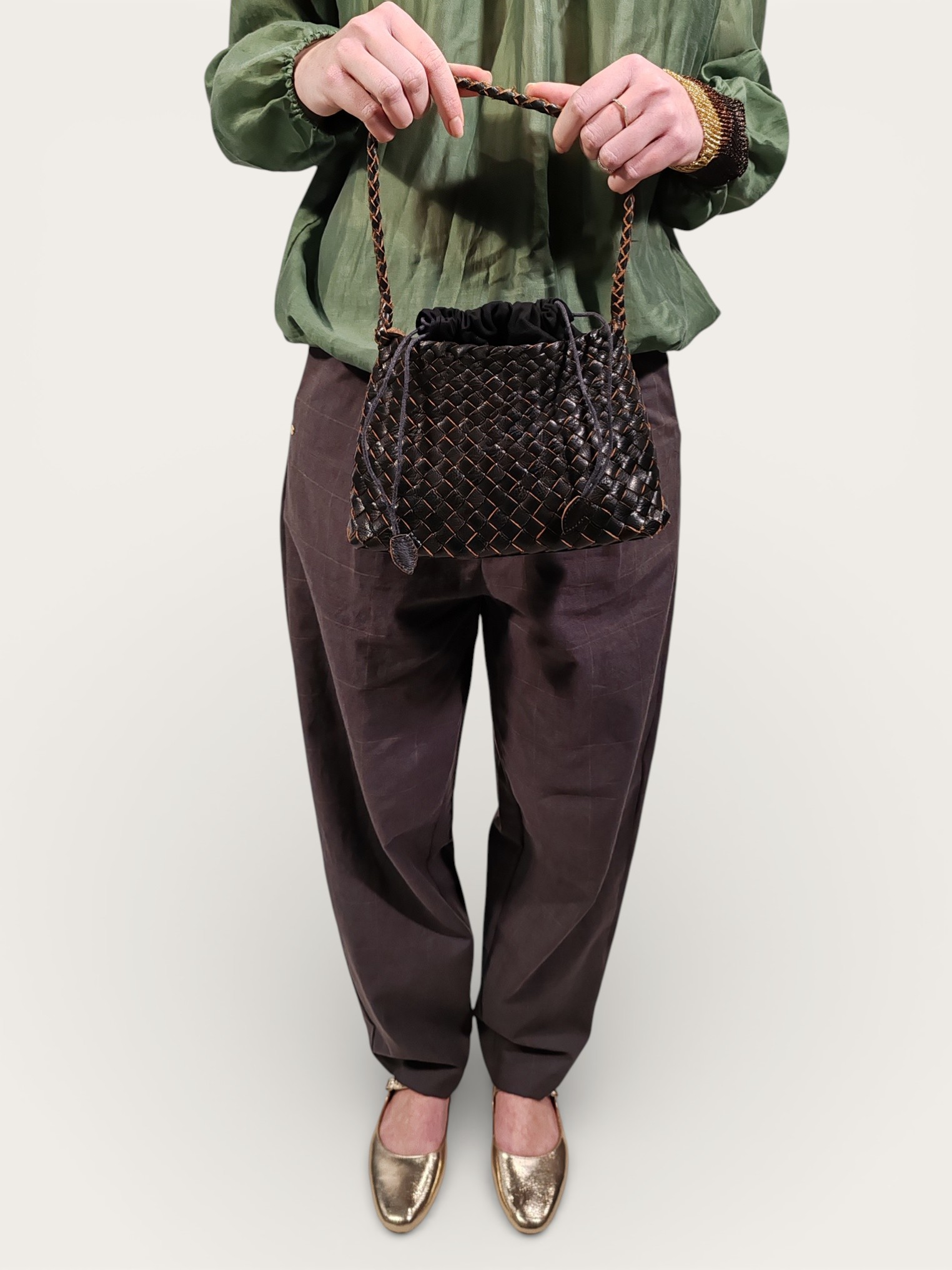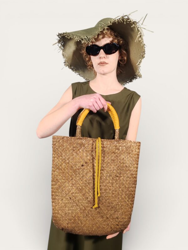 La silhouette morbida e arrotondata è valorizzata da un sottile manico tubolare intrecciato, che ne accentua l’estetica artigianale e ricercata.