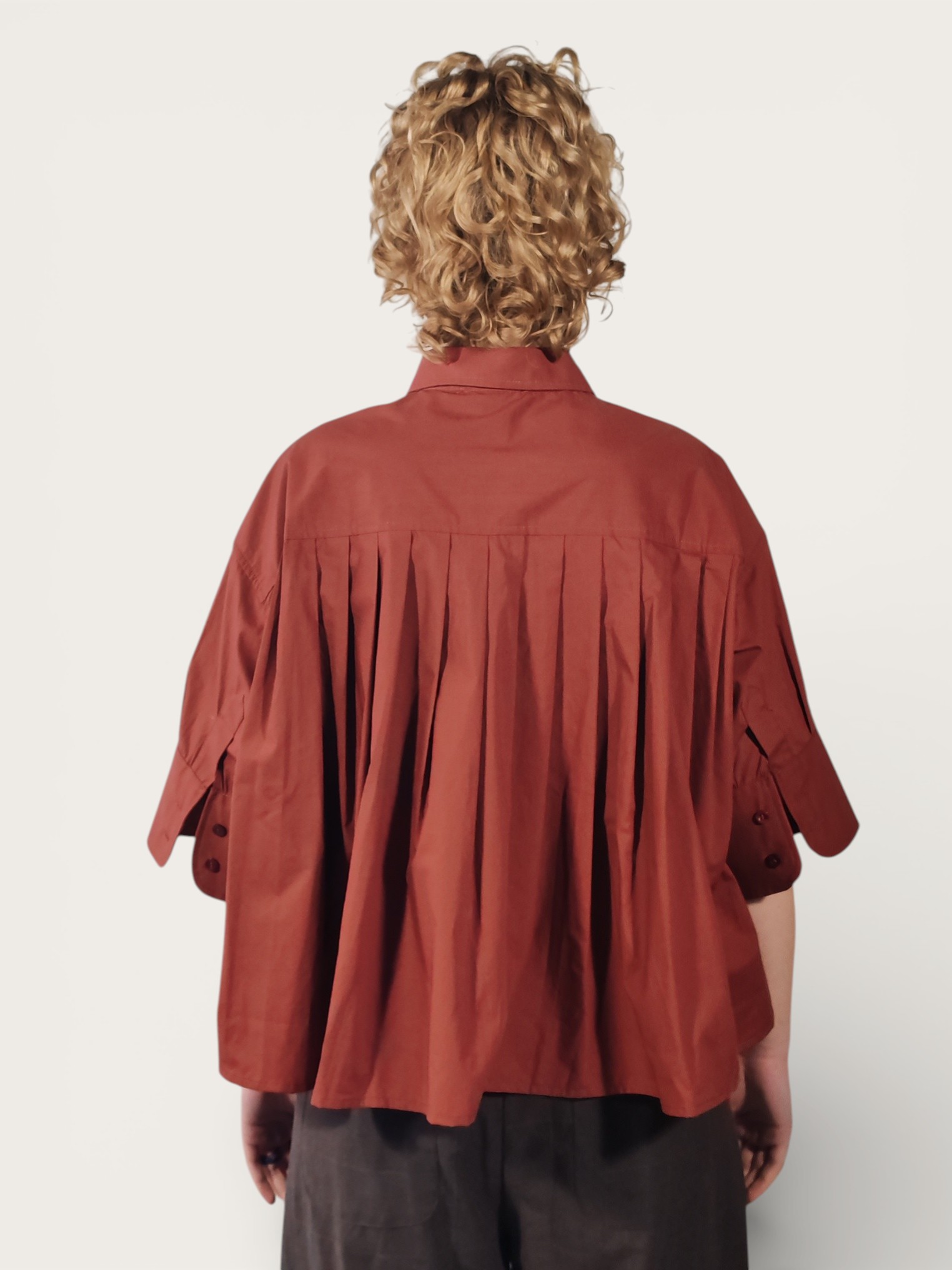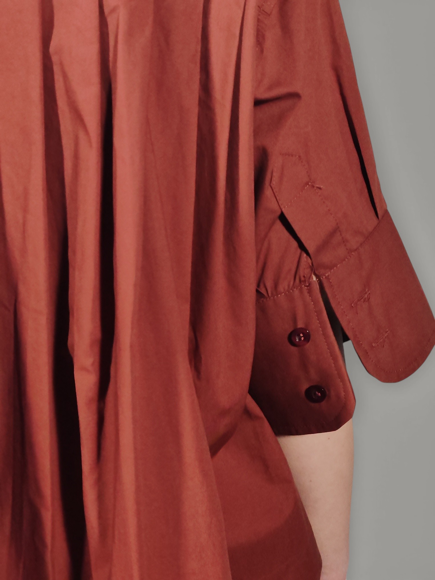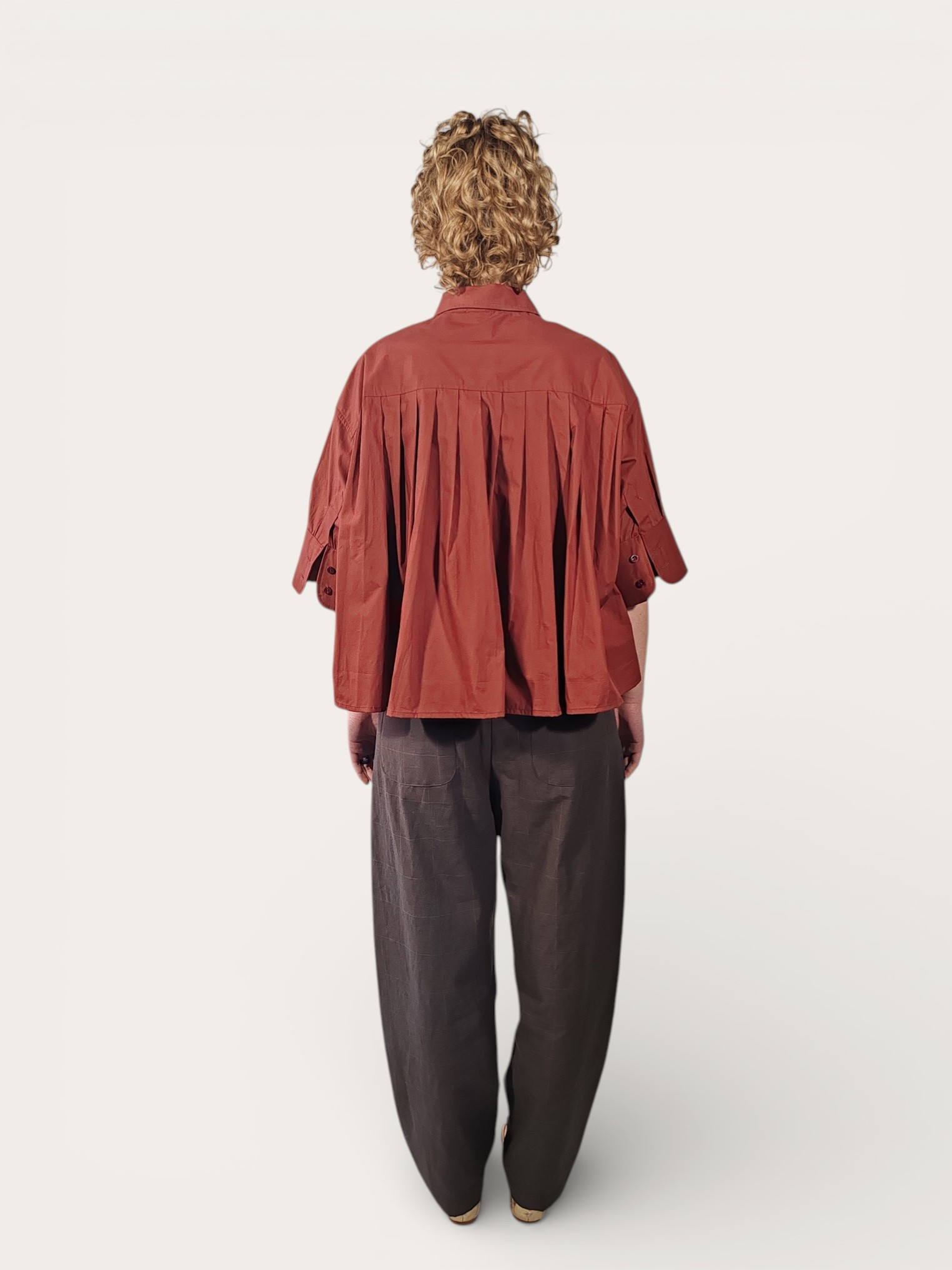 Camicia manica corta in cotone, caratterizzata da una mano fluida e una lucentezza discreta che esalta la profondità della tonalità terracotta.