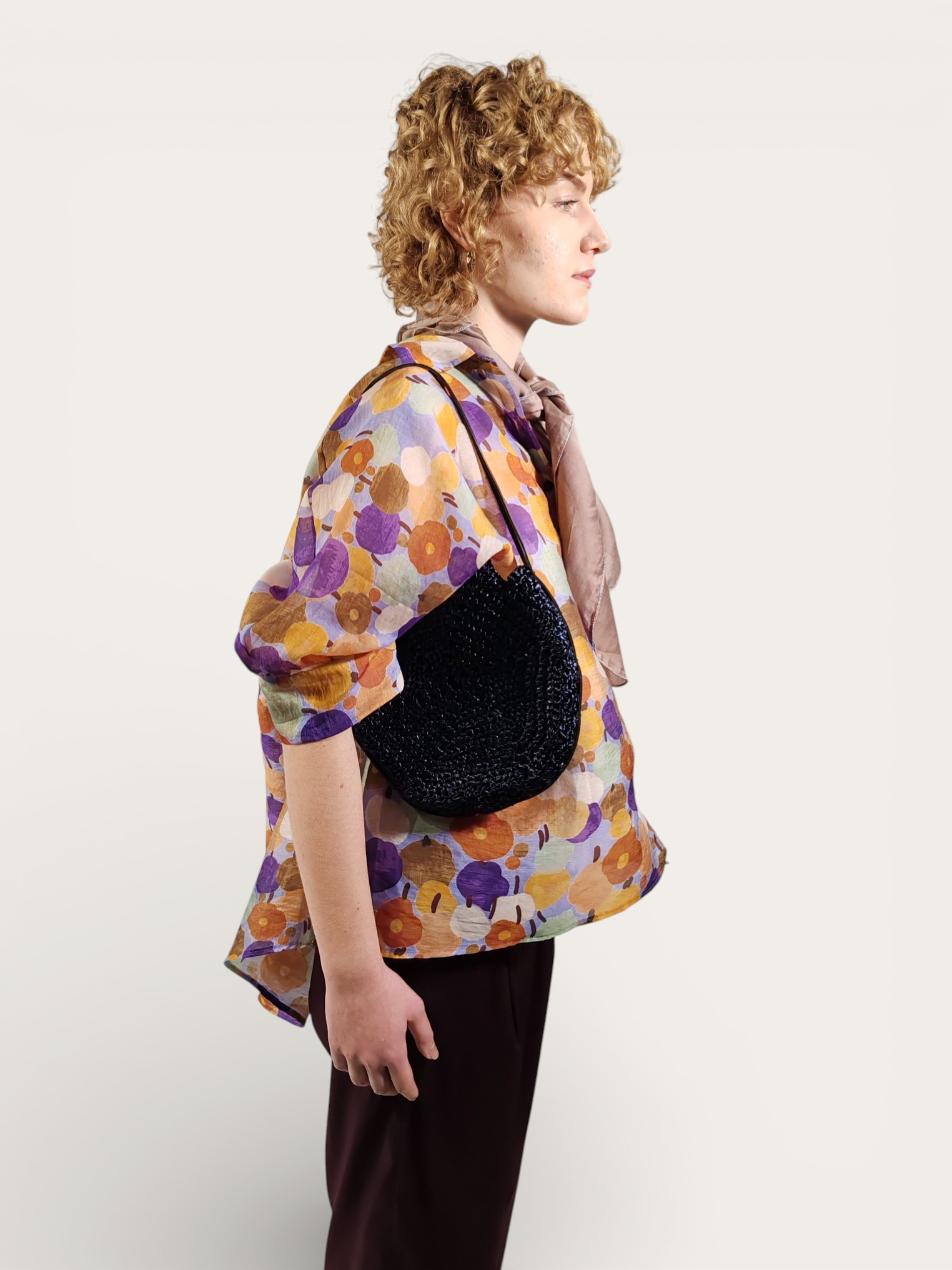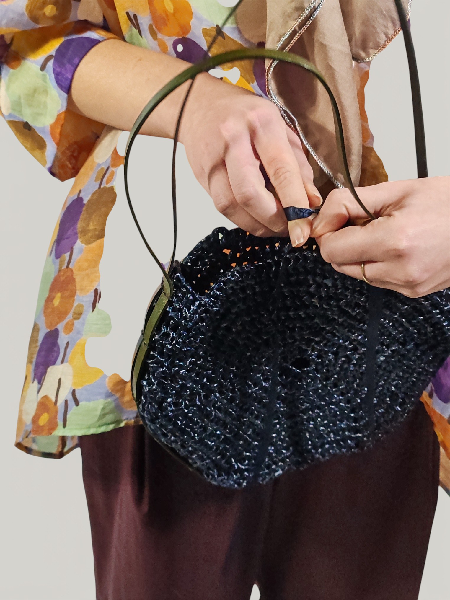 Priva di fodera per esaltare la leggerezza e la trasparenza della fibra naturale, si chiude in modo pratico grazie a un morbido laccetto in tessuto silky coordinato.