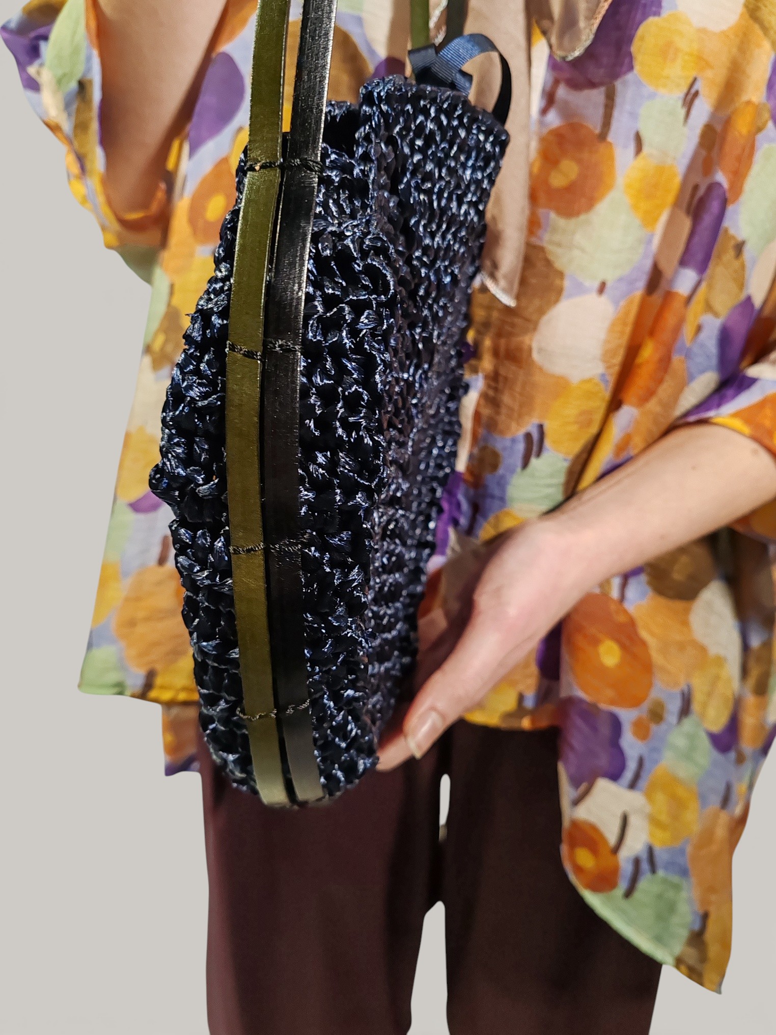 Questa borsa Rosamunda presenta un’estetica naturale e materica, realizzata in rafia blu notte con una fitta lavorazione a intreccio circolare che ne esalta la silhouette arrotondata.