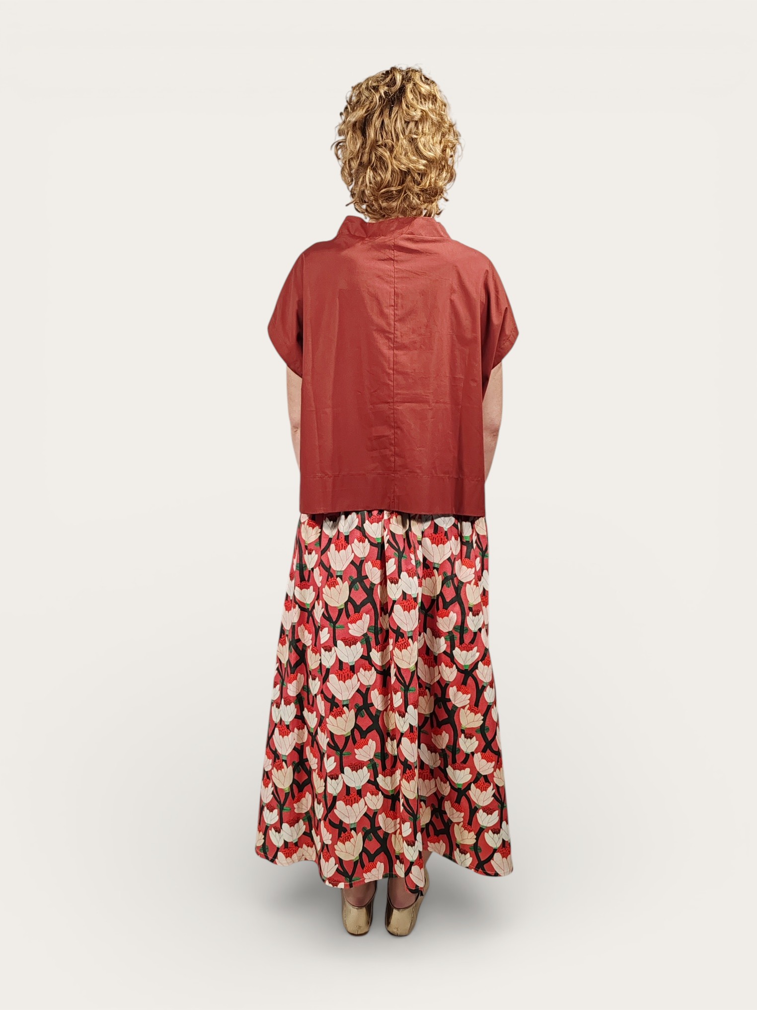 Gonna midi con macro-motivo floreale nei toni del rosso corallo, crema e verde salvia, realizzata in un tessuto di cotone che mantiene un volume elegante.