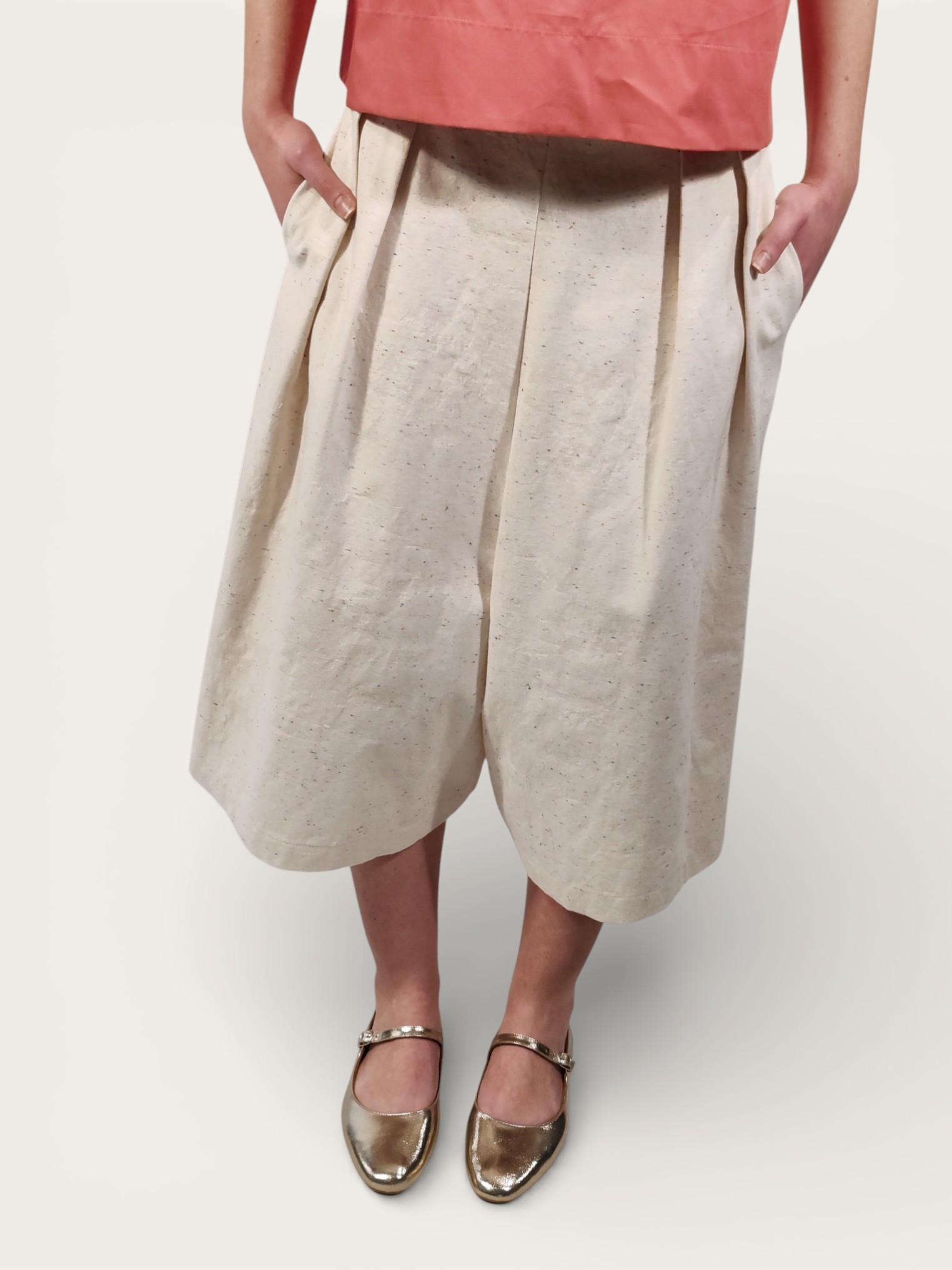 Gonna pantalone in tela di cotone, caratterizzata da una mano materica e una finitura naturale che esalta la tonalità neutra del color avorio con leggere screziature colorate.
