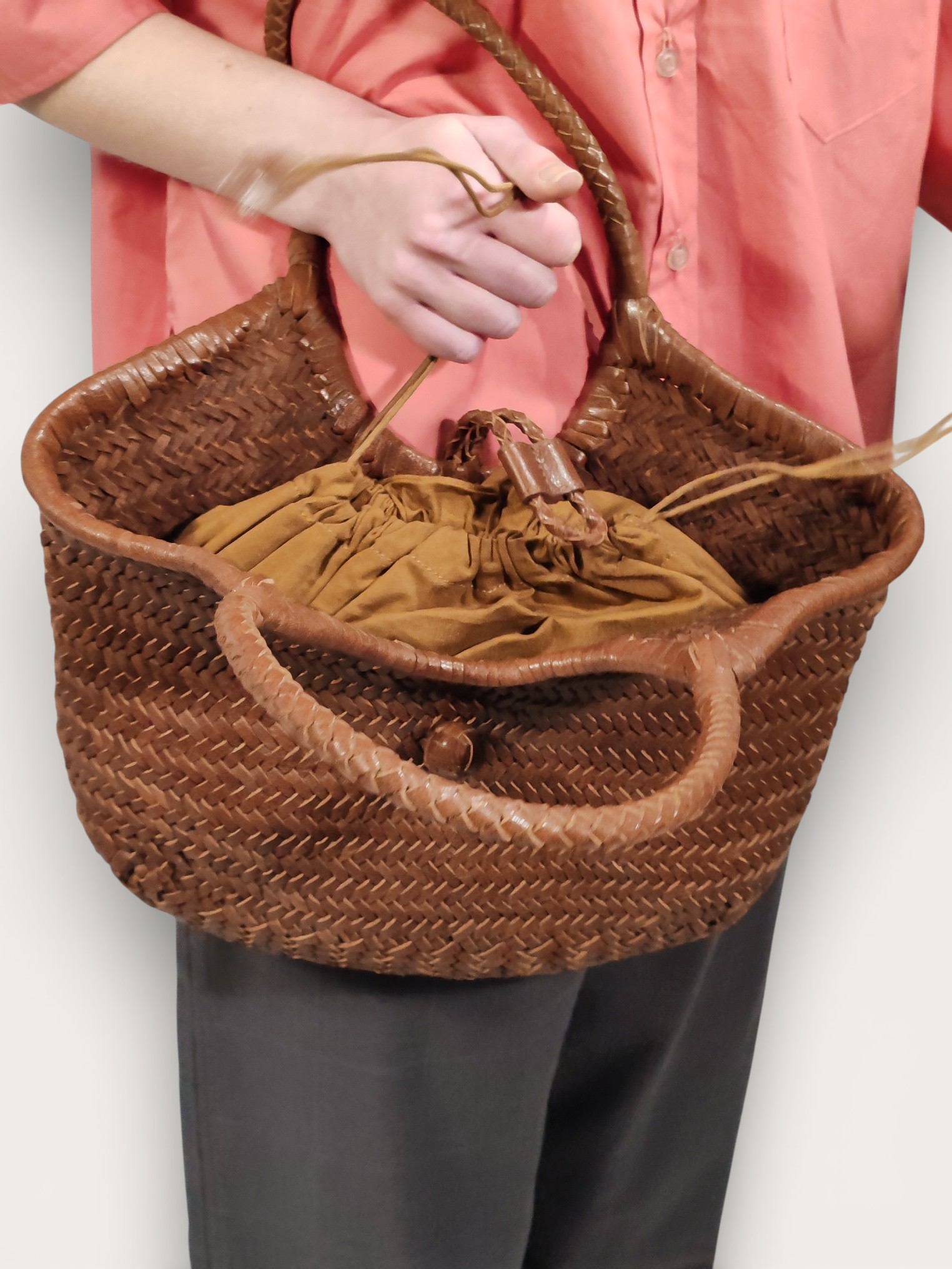 Questa borsa Rosamunda sfoggia una silhouette a mezzaluna (hobo) dal fascino senza tempo, interamente realizzata in un pregiato intreccio di pelle color cuoio con trama a spina di pesce.
