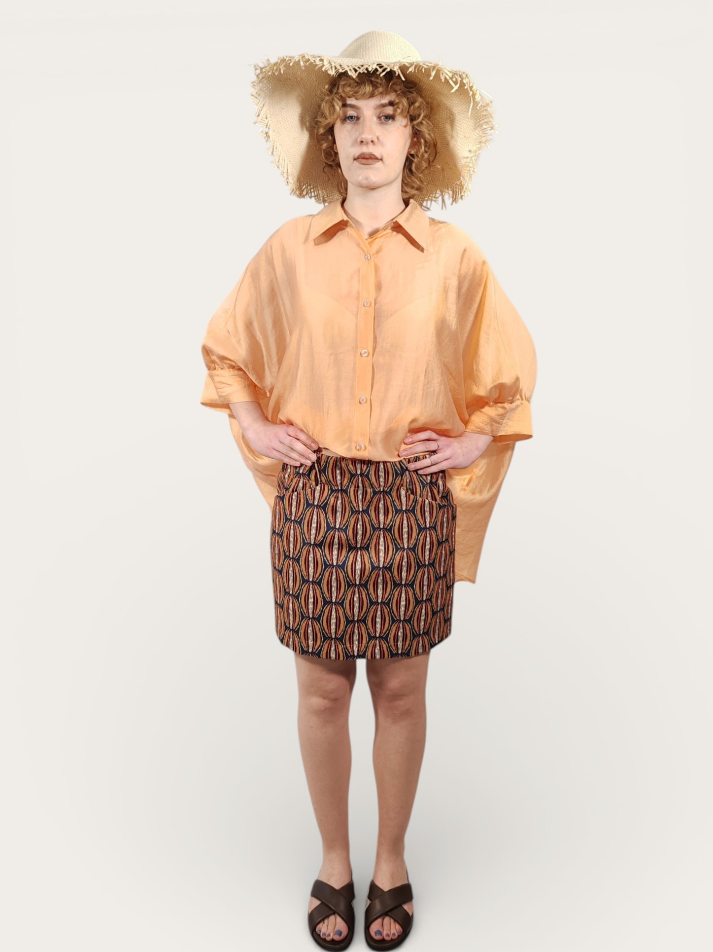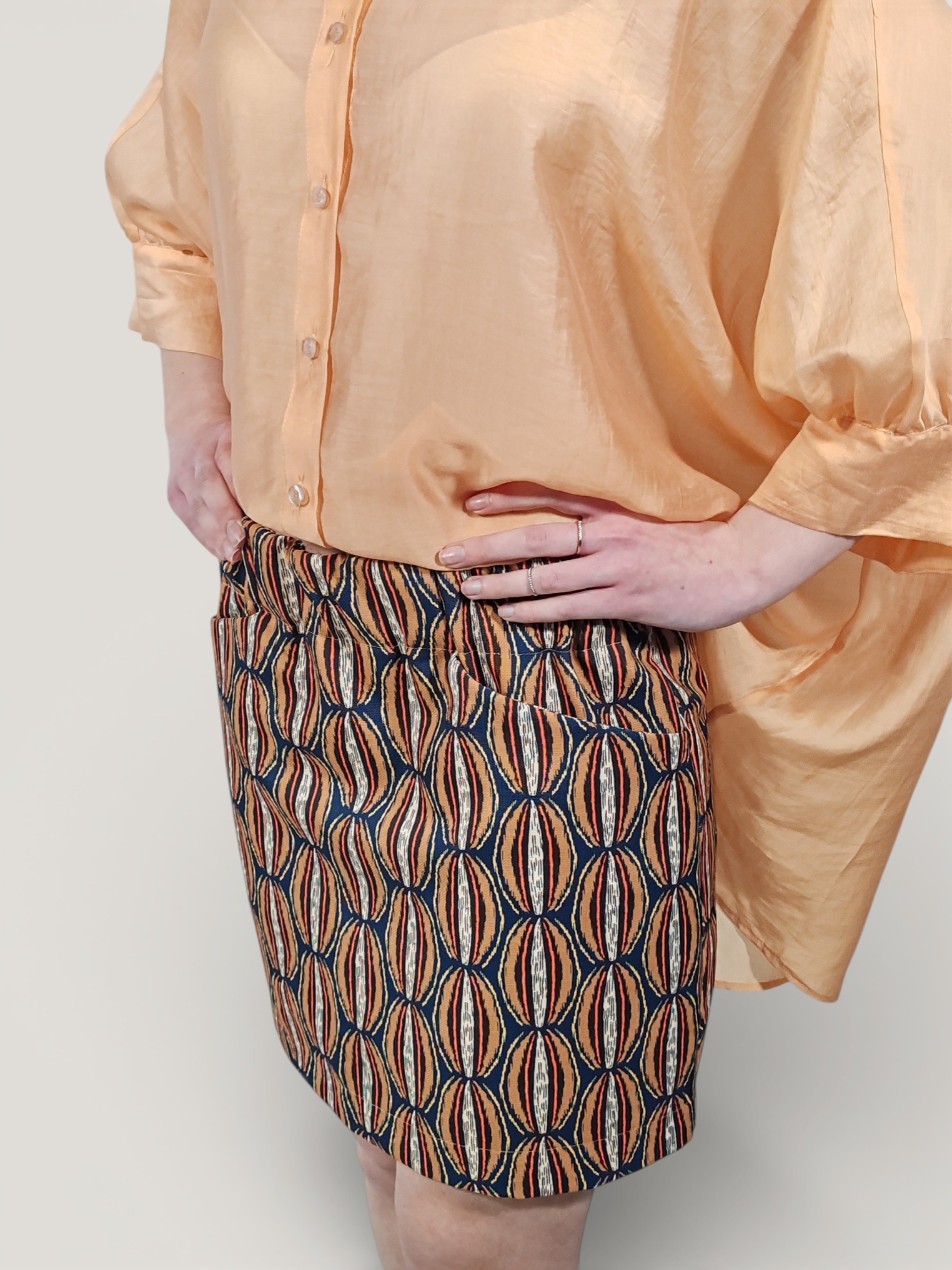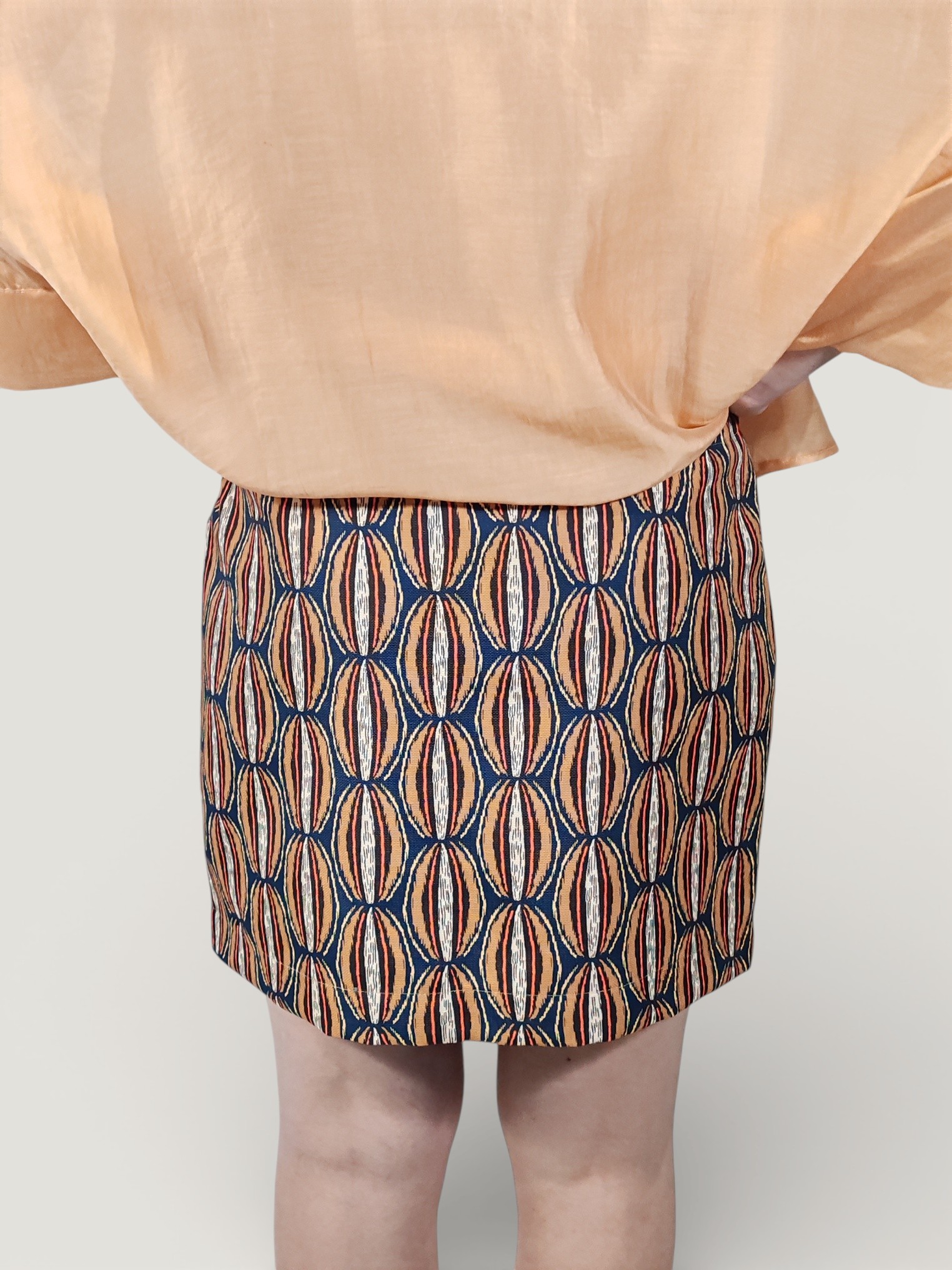 Minigonna con motivo dal gusto rétro, caratterizzato da un intreccio cromatico di ocra, ruggine e panna su una base blu notte.