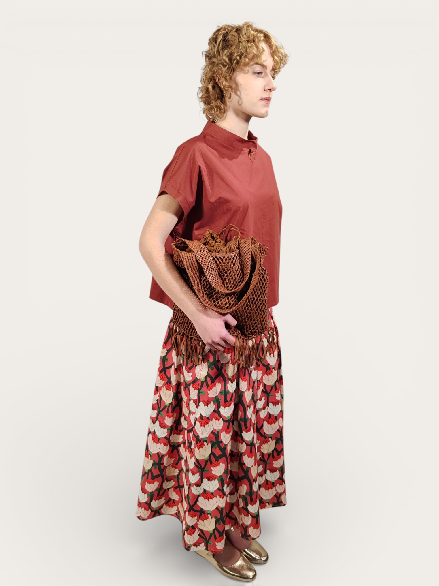 Questa borsa shopper Rosamunda si distingue per un ricercato design d’ispirazione boho-chic, caratterizzato da un fitto intreccio a rete in pelle color cuoio.
