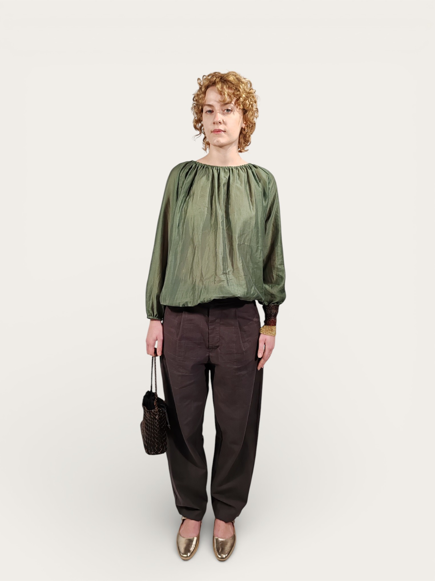 Le doppie pinces frontali aggiungono profondità e struttura, mentre il bacino morbido garantisce un comfort assoluto.