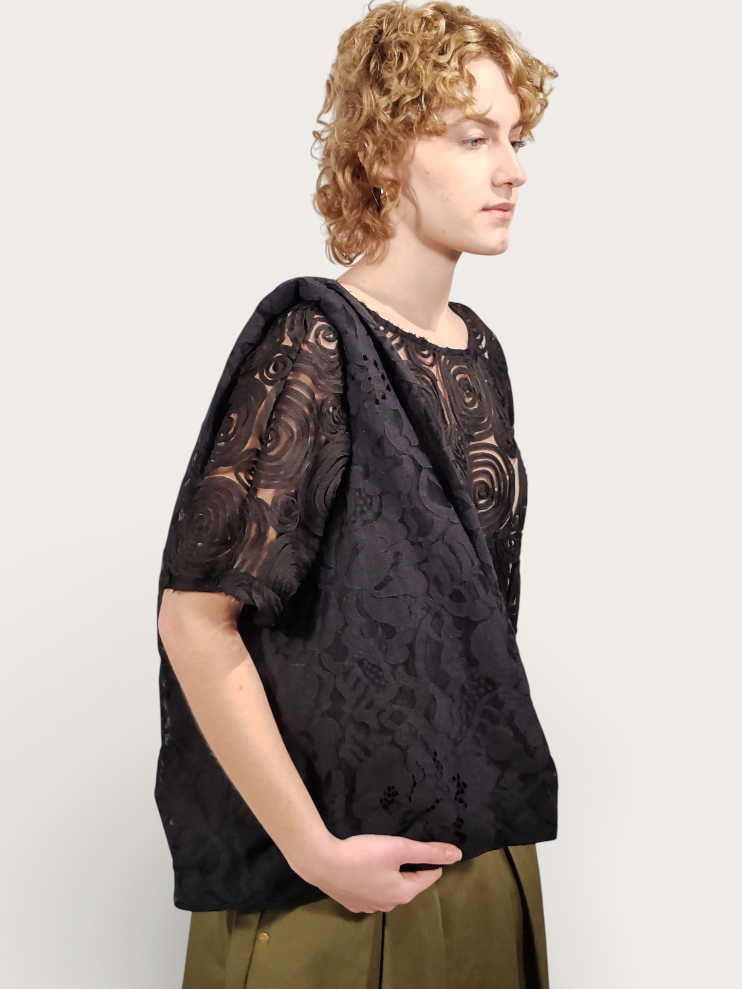 Questa borsa shopper Rosamunda si distingue per un’estetica romantica e sofisticata, realizzata in un prezioso pizzo nero con motivi floreali a rilievo.