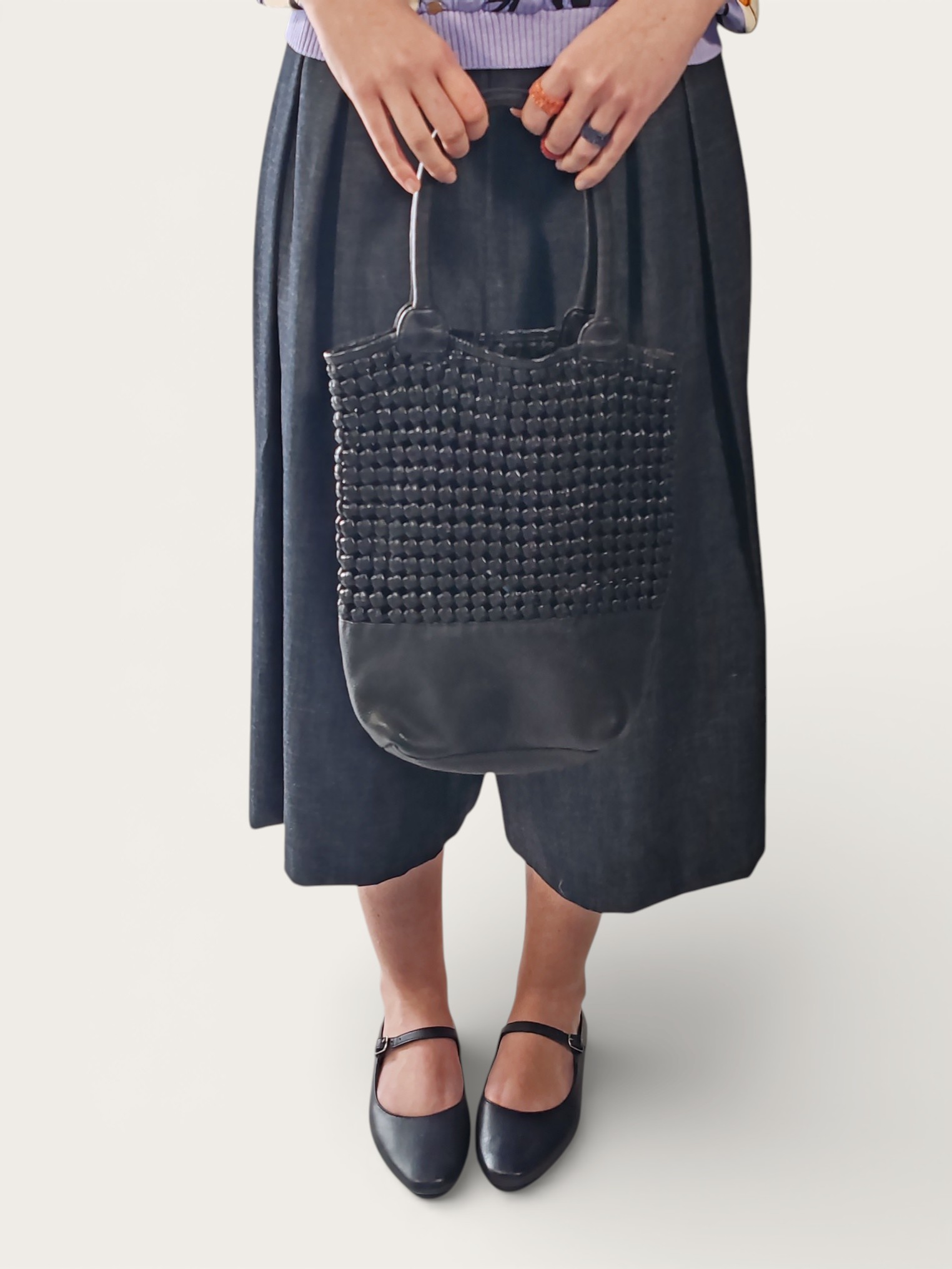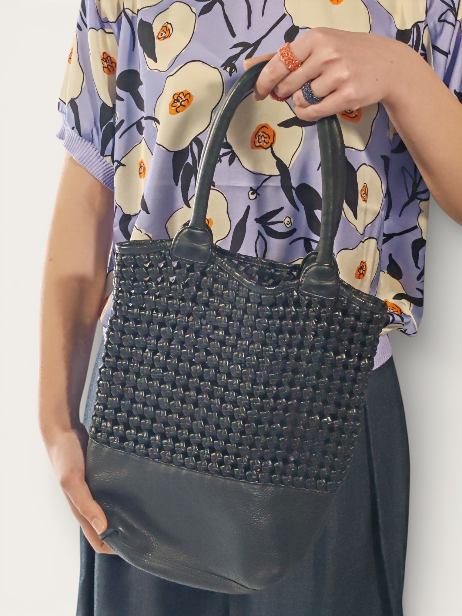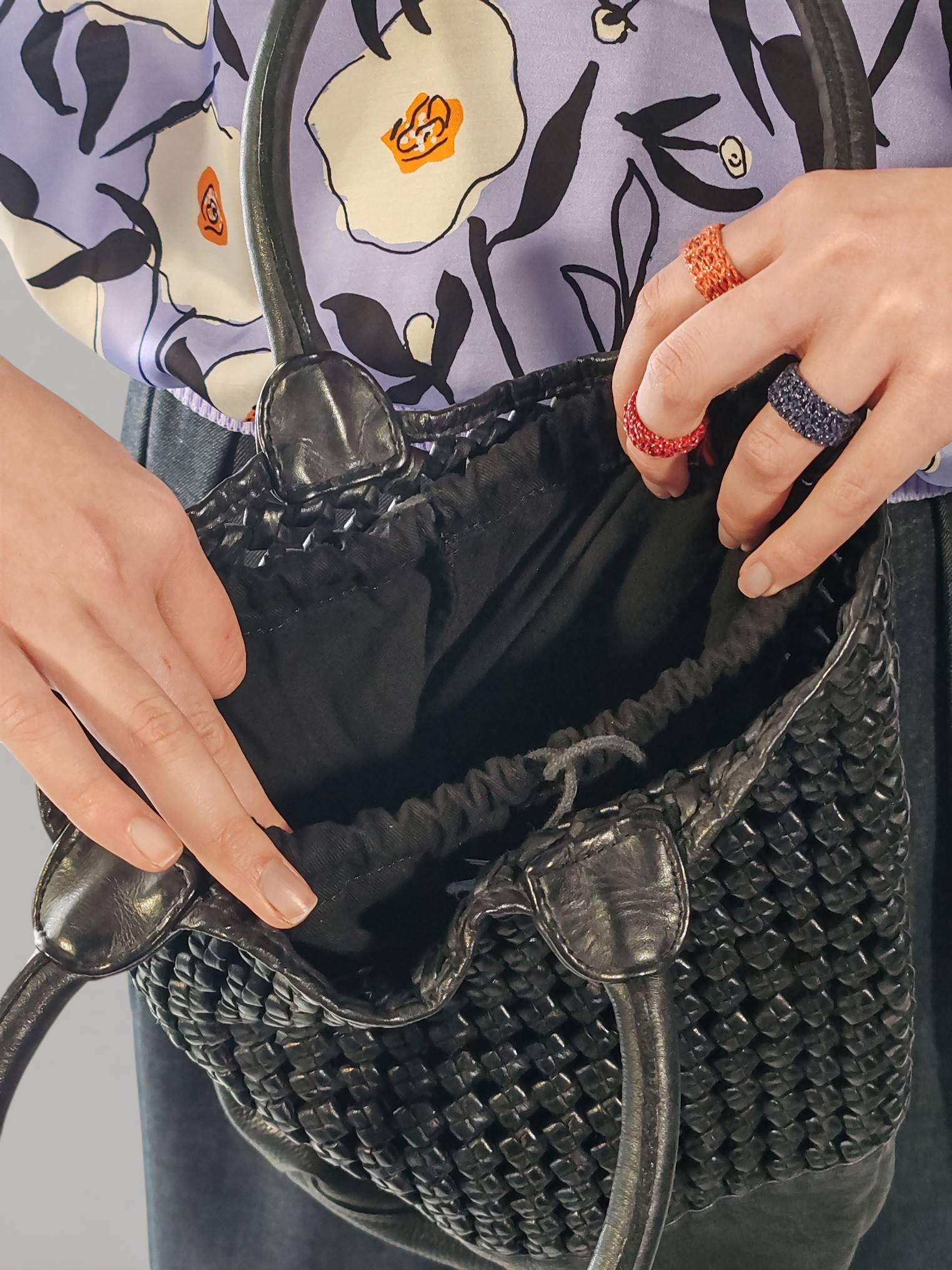Questa borsa a secchiello Rosamunda si distingue per un raffinato design materico che alterna un sofisticato intreccio in pelle nera a una base solida in pelle liscia.