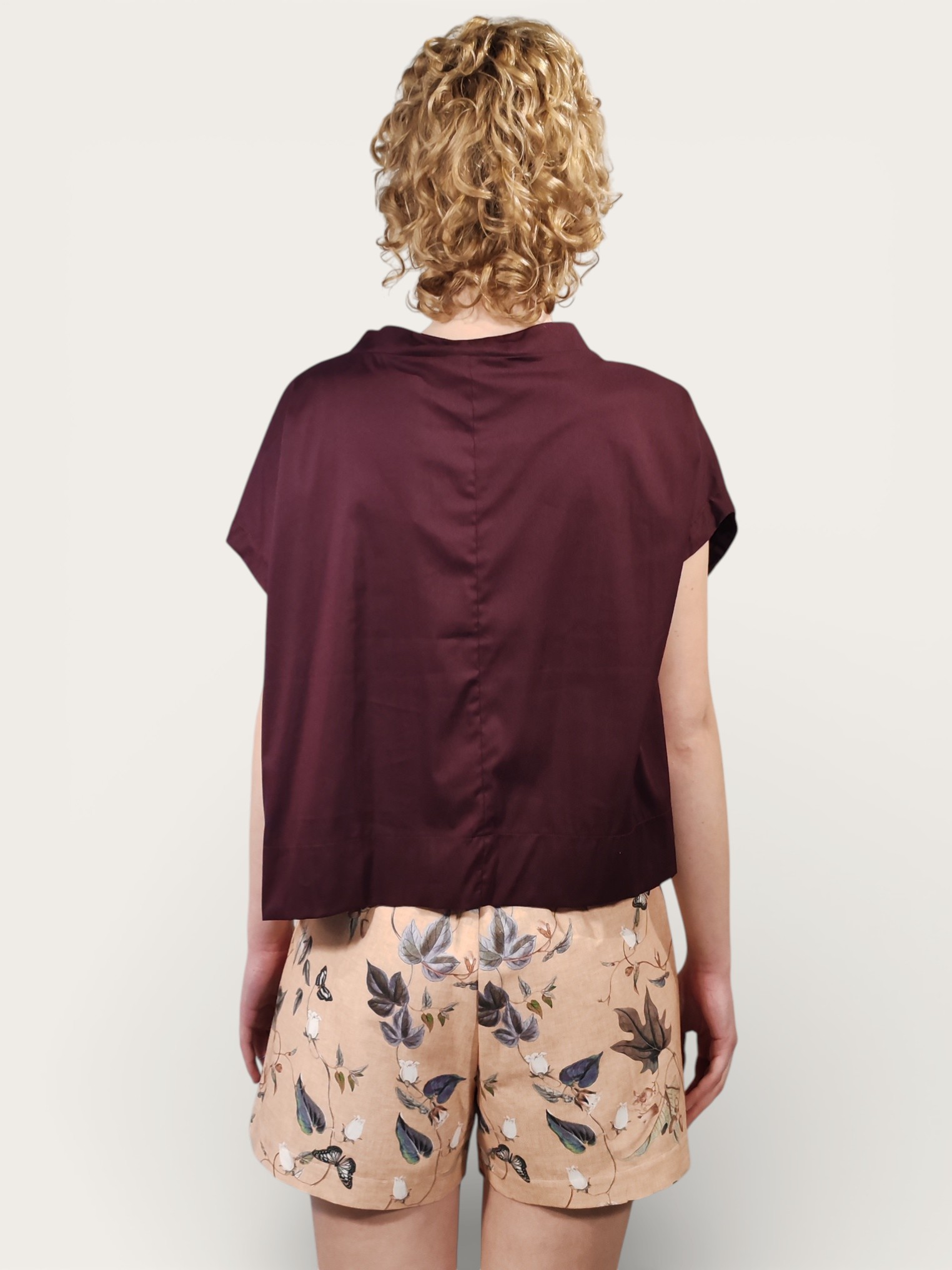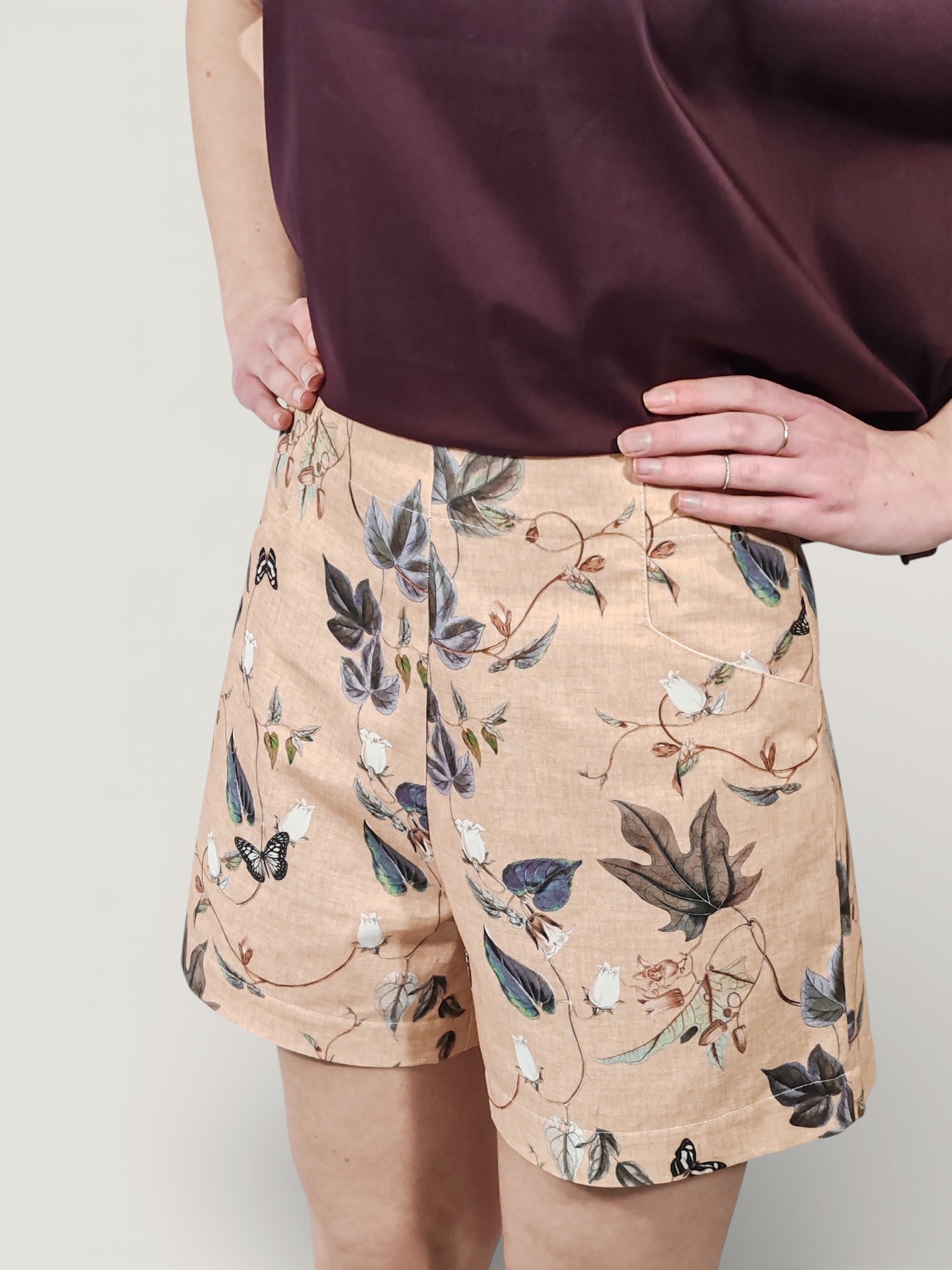 Shorts in cotone stampato, caratterizzati da una mano fresca e una finitura naturale che esalta la delicatezza del motivo botanico con foglie e farfalle su base rosa.